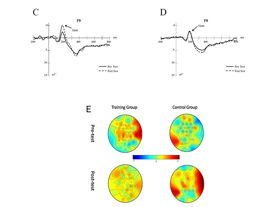 Figure 1 N160 trends of training and control groups (P7, P8). C is the training group results of pre- and post-test, and D is the control group results. Scalp topographies of the two groups on N160 are demonstrated on E.