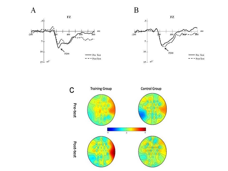 Figure2 P200 (FZ) trends in the training and control groups. A is P200 changes between the pre- and post-test in the training group, and B is the results of the control group. Scalp topographies of the two groups on P200 are demonstrated on C.