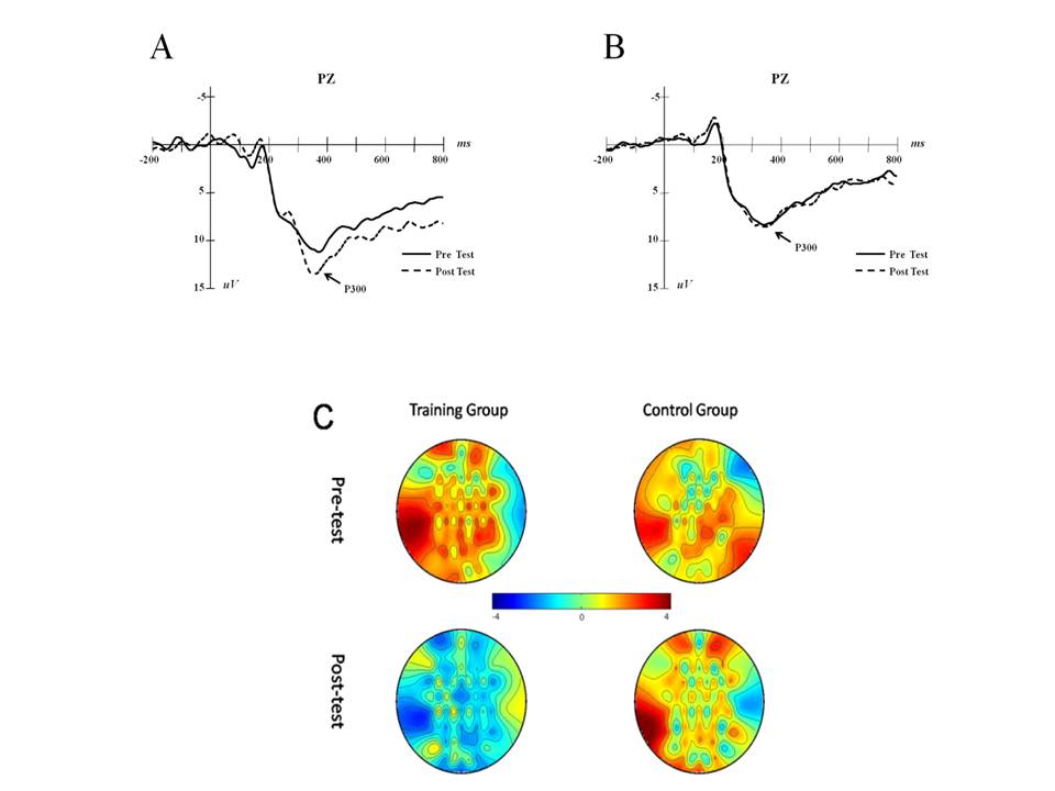 Figure 3 P300 (PZ) trends in the training and control groups. A is P300 changes between the pre- and post-test in the training group, and B is the results of the control group. Scalp topographies of the two groups on P300 are demonstrated on E.
