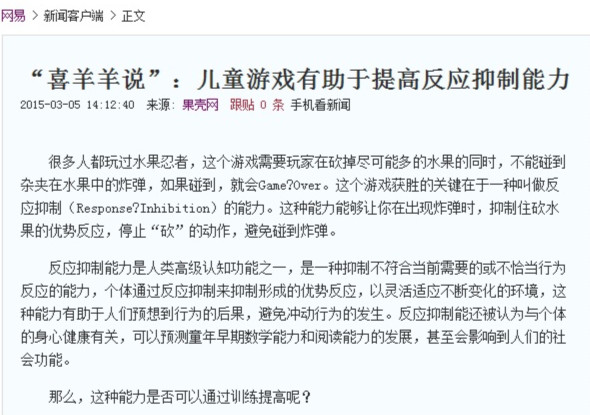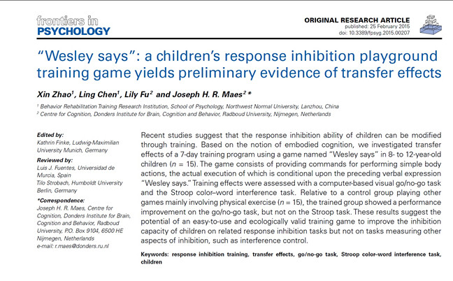 该项研究成果于2015年2月25日在《Frontiers in Psychology》杂志在线发表,浦京赵鑫博士为该论文的第一作者,350vip浦京集团官网行为康复训练研究中心为第一完成单位。研究一经发表,便受到国内科技媒体的关注。著名科技网站“果壳网”在2015年3月4日以“喜羊羊说”:儿童游戏有助于提高反应抑制能力”为题在首页对此项研究成果进行了推介,网易新闻中心、快科技以及国内一些网站的科技频道也对此项研究成果进行了转载和报道。