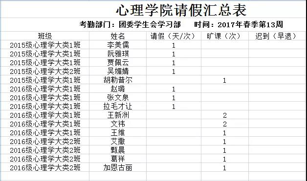2017年春季学期第13周350vip浦京集团官网考勤公示如下,如有疑问请联系院团委学生会学习部。