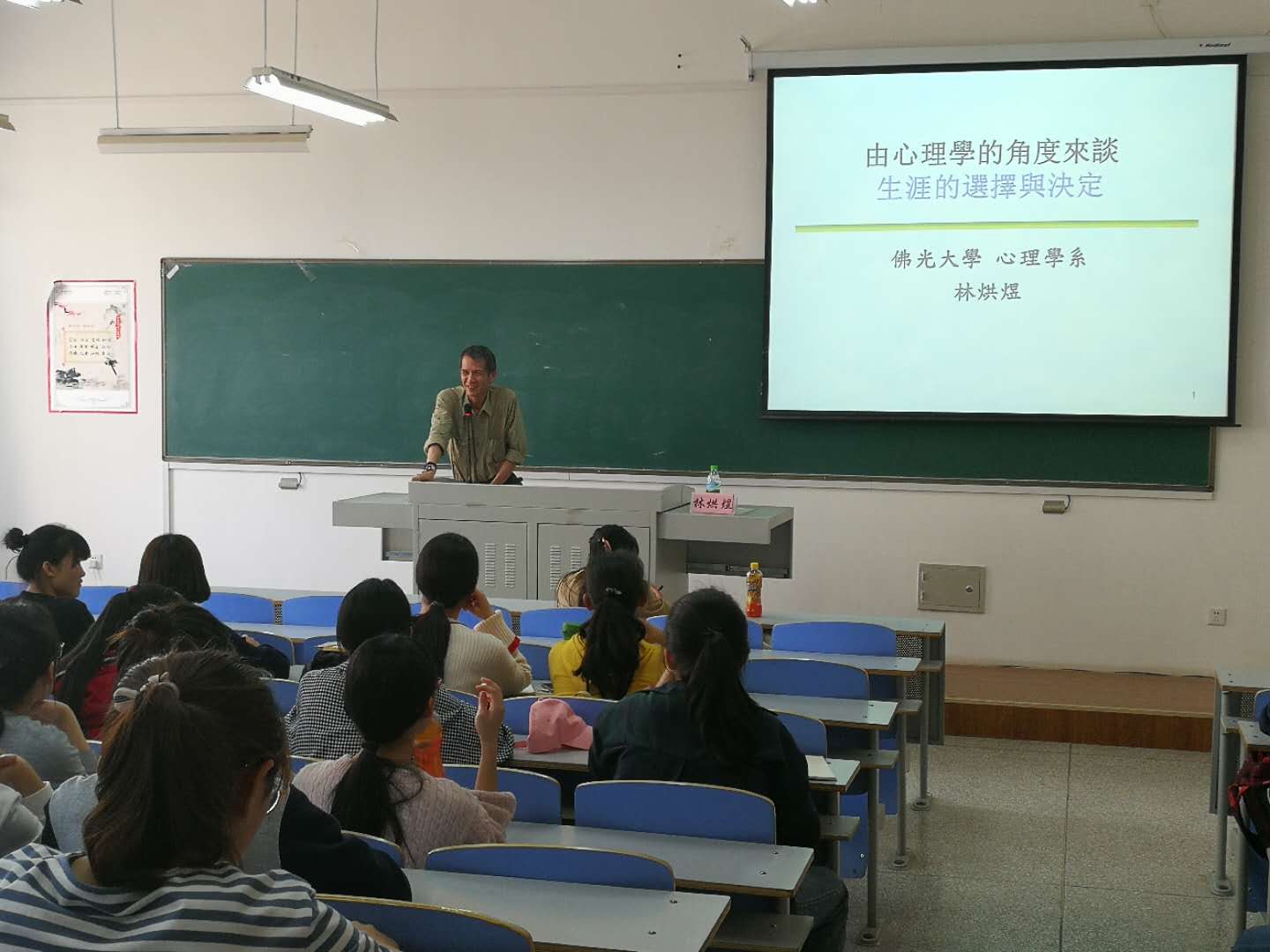 三月二十九日下午,台湾佛光大学心理学系主任林烘煜教授在来陇的第五天,应邀为浦京本科学生做了主题为“心理学群与生涯发展规划”的讲座。