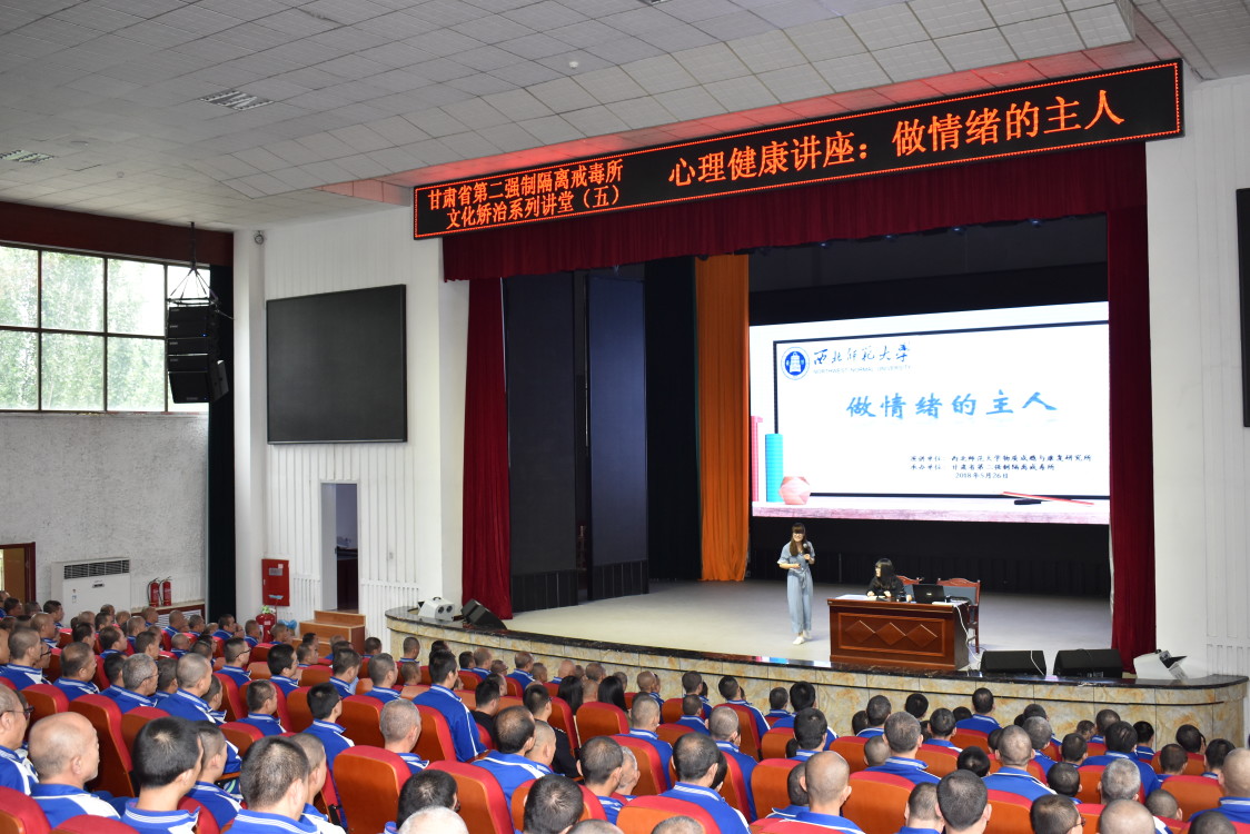 在5.25心里健康日以及禁毒宣传月来临之际,350vip浦京集团官网物质成瘾与康复研究所为提高戒毒人员心理健康水平、提升情绪管理能力,与省二所心理矫治中心合作,于2018年5月26日在省二所大礼堂开展了以《做情绪的主人》为主题的心理健康知识讲座与正念训练活动。活动由物质成瘾与康复研究所负责人杨玲教授的2位在读研究生何圆圆、郭瑾瑾承担主讲。在活动准备期间,杨老师从选题到内容、从讲授到正念训练进行了全方位的指导,研究所其他同学在试讲时也提供了宝贵的建议。这次活动,也是研究所除了杨老师之外第一次由研究生作为主讲人的对外报告。