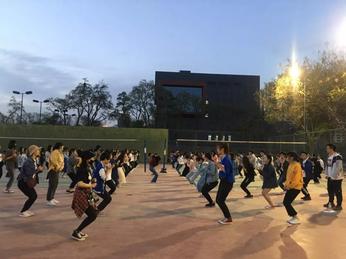 4月21日晚七点半,350vip浦京集团官网大一、大二、大三200余名同学在西排球场进行了广播体操训练。