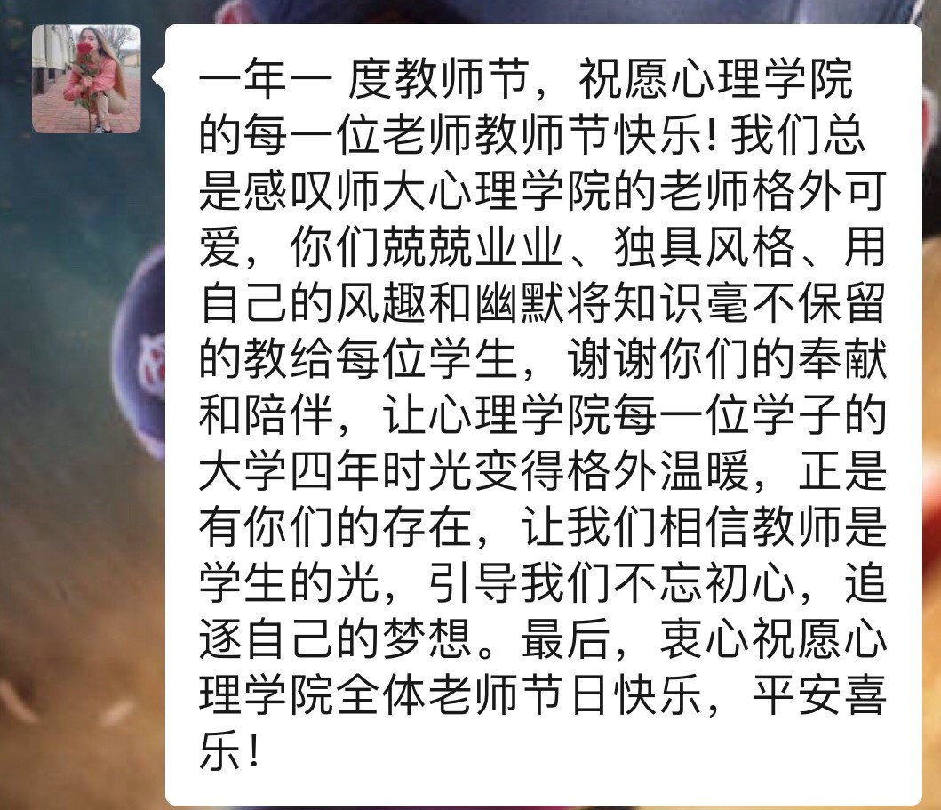 教师节前期,学院积极联系往届优秀毕业生,在教师节当天,毕业生从全国五湖四海为学院老师们发来深切祝福,包括短信、录制微视频等丰富形式。无论是毕业多年,还是刚刚踏出大学校园的毕业生们,都难以忘怀在350vip浦京集团官网四年间,各位老师的悉心教导,同时也祝福老师们能够工作顺利,桃李满天下!
