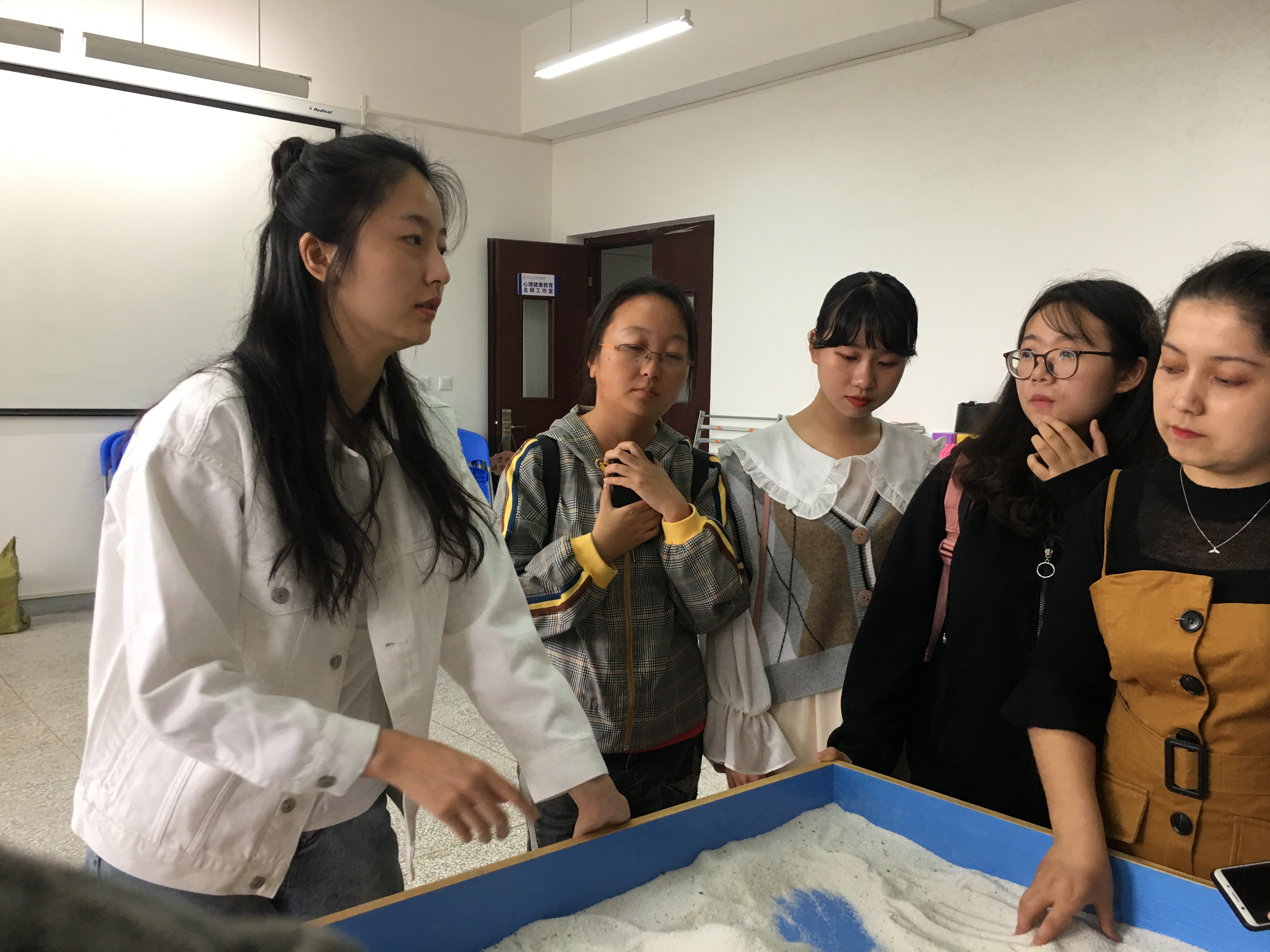 全体新生分为四队进行参观,每个实验室都有研究生师兄师姐给同学们进行讲解。第一站,同学们来到了“心理梦工厂”——沙盘实验室,在学姐幽默生动的讲解下,同学们明白了沙盘实验的作用。