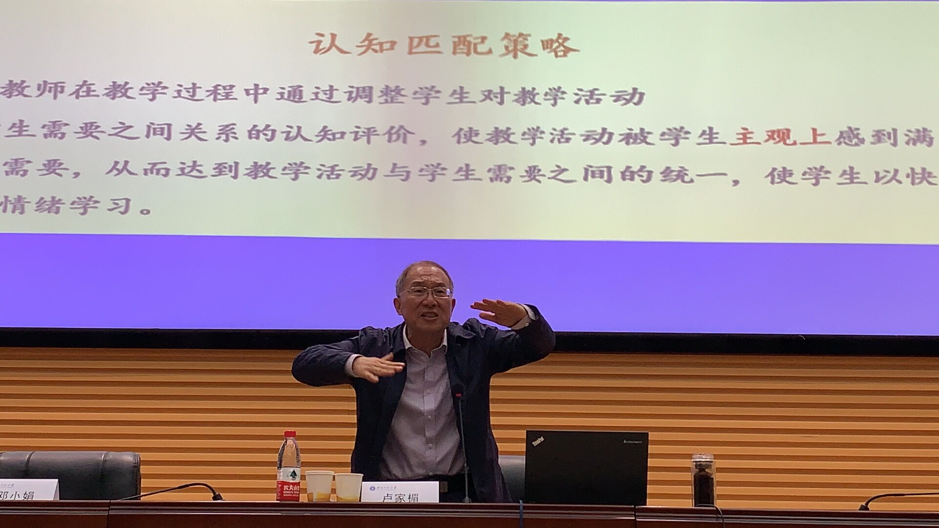 卢家楣教授在报告中,用大量生动而鲜活的案例,详细讲述了教学的情知矛盾论、教学的导乐论、情感教学模式论等十大情感教学理论,同时声情并茂地讲述了与理论相对应的具有操作性、实效性的两套情感教学策略体系与实践应用方法,同时论证了“以情优教”在陶冶学生高尚情感、培养学生情绪智力和促进学生学习等方面的巨大价值,并且,卢教授就就相关问题和现场师生进行了交流互动。卢教授以幽默风趣的语言把理论化的知识讲得形象化,引得现场掌声不断。