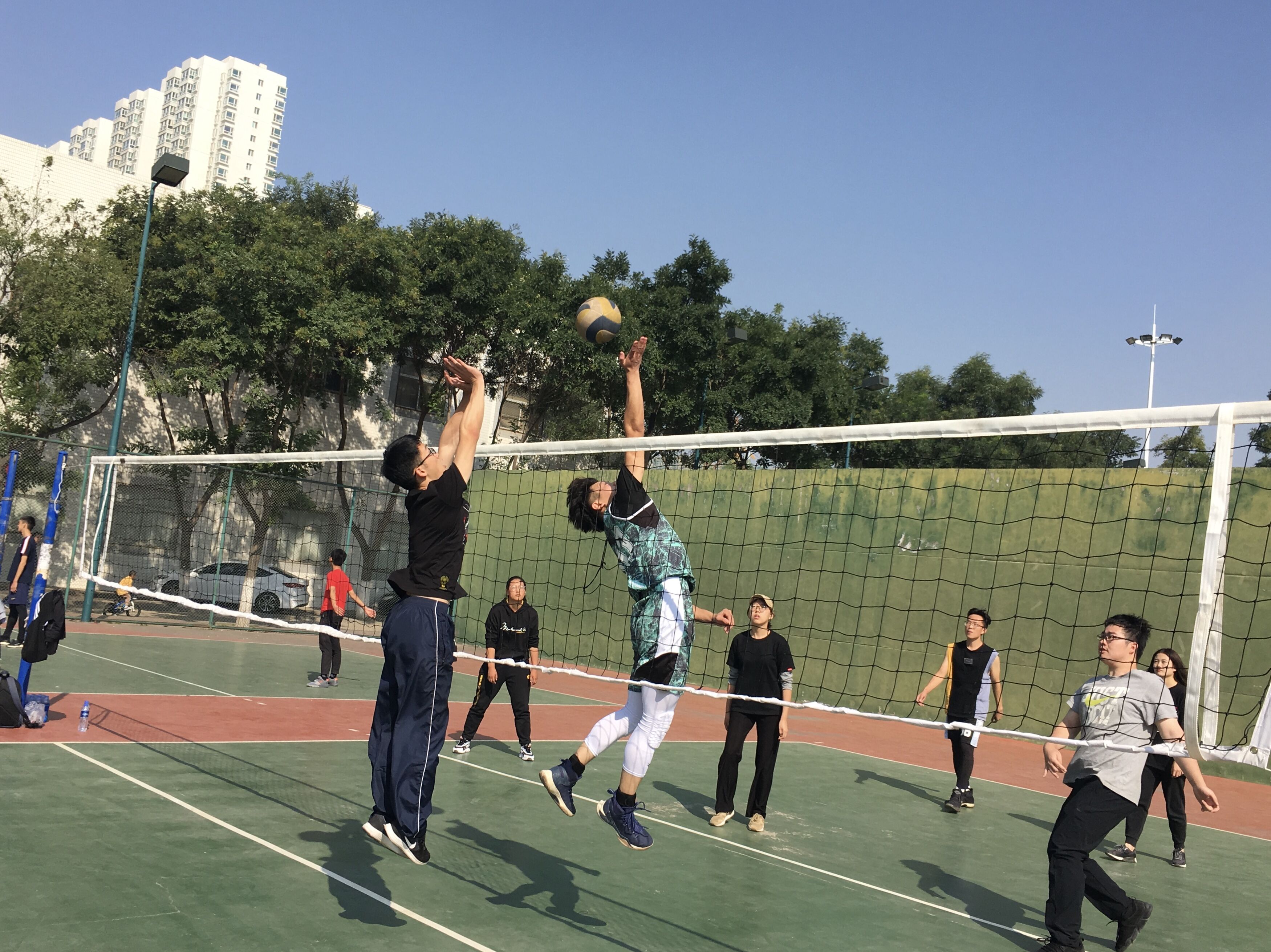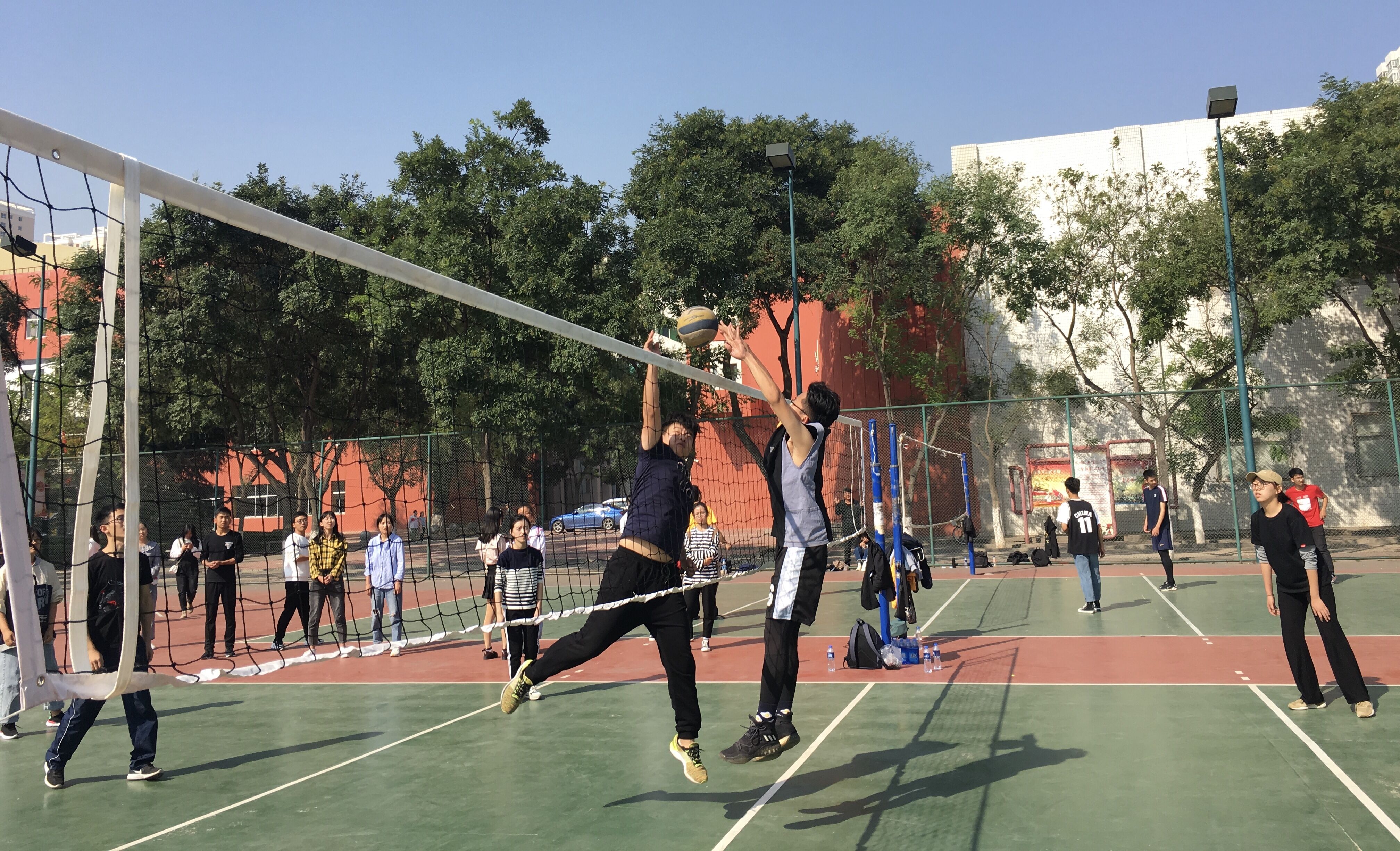 开赛之前,双方各队员进行着赛前热身、战术规划与站点安排。各年级的同学聚集在旁期待着这场精彩的赛事。随着裁判的哨声响起,比赛拉开了序幕,双方队员拼尽全力,各施绝活,通过一次次完美的配合,完成了一个个精彩的救球、拦球、扣杀。各年级的啦啦队也在一旁为各自的队伍呐喊助威。新生一方虽然比分较为落后,但他们仍拿出了永不服输的体育精神,和高年级队伍在球场上拼打的有来有回,一直努力追回比分。他们都是好样的!