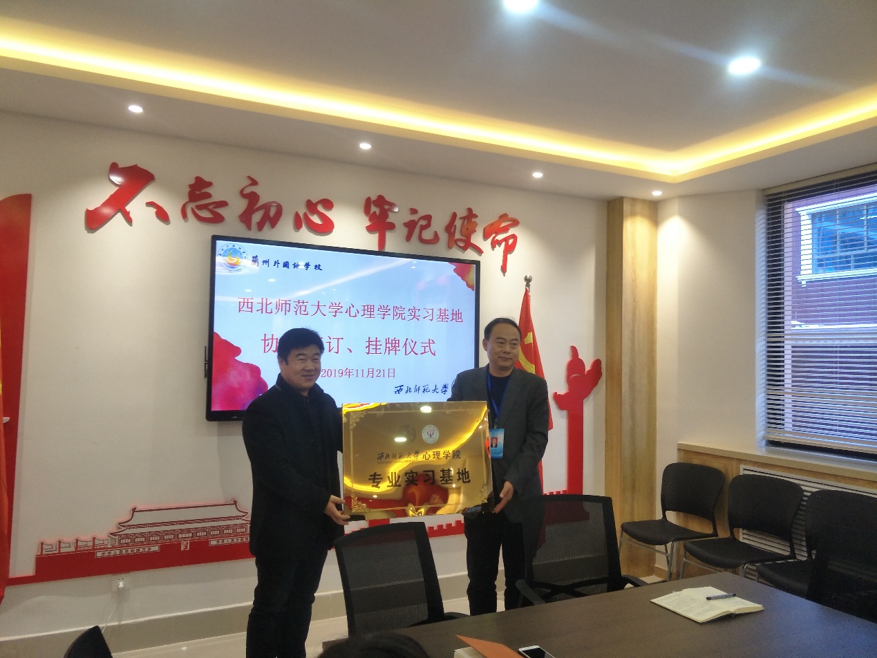 从2019年8月初开始,学院积极与兰州市各中小学、职业学校协商沟通,确定指导教师选派和聘任、学生进校及实习的具体落实与安排等,并与兰州市第二中学、水车园小学、兰州外国语学校等单位签署“350vip浦京集团官网专业实习研修合作基地协议书”,开展350vip浦京集团官网专业实习研修合作基地建设。2019年11月21日,350vip浦京集团官网康廷虎副院长先后到兰州市外国语学校、水车园小学看望在那里的实习、见习的本科生、研究生,并向两个实习基地授“350vip浦京集团官网专业实习基地”牌。2019年11月25日,350vip浦京集团官网丁小斌副院长、教学督导杨玲教授、实习指导教师张荣华副教授,赴兰州市第二中学检查本科生实习,了解实习基地建设情况,并向该校授牌。