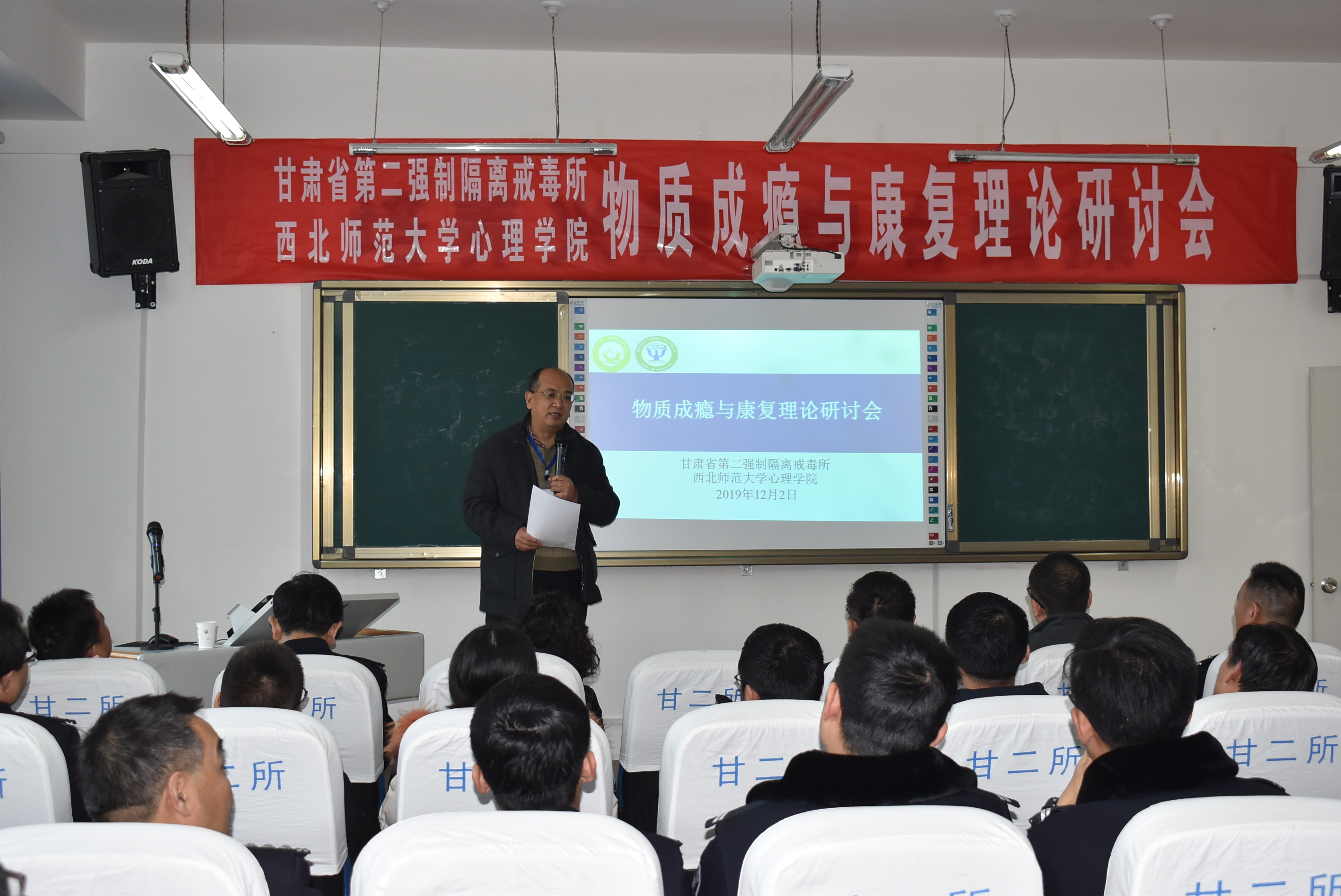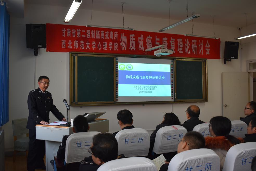 2019年12月2日下午3点,在甘肃省第二强制隔离戒毒所,举行物质成瘾与康复理论研讨会,350vip浦京集团官网教师与戒毒所干警共同探讨物质成瘾与康复过程中的心理矫治工作理论研究与戒治实践。学院周爱保院长、赵鑫副院长、杨玲教授参加此次研讨会。