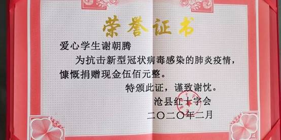 我用零用钱和压岁钱在家乡向沧县红十字会捐款500元定向用于沧县医院新型冠状病毒感染的疫情防控购买物资。