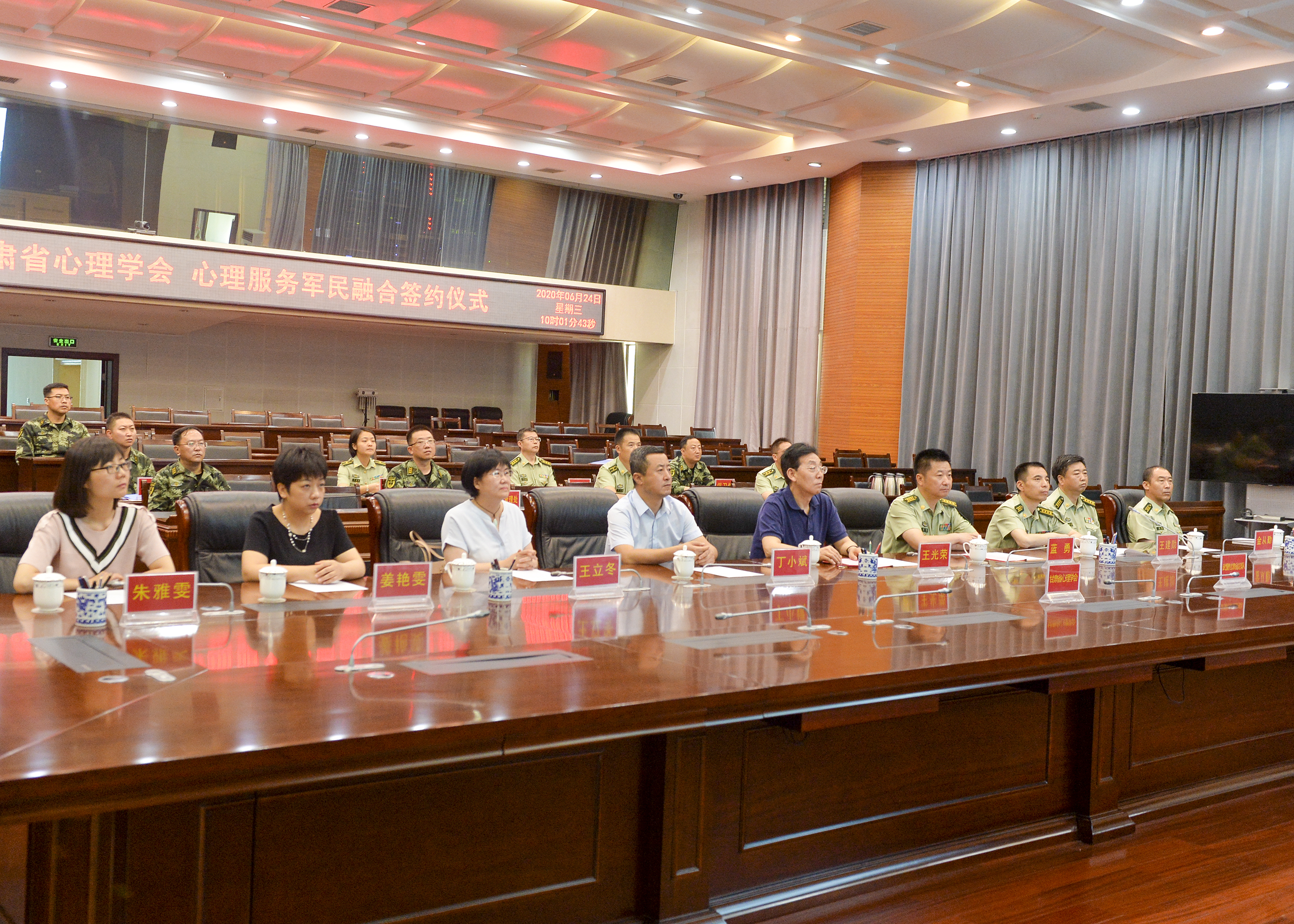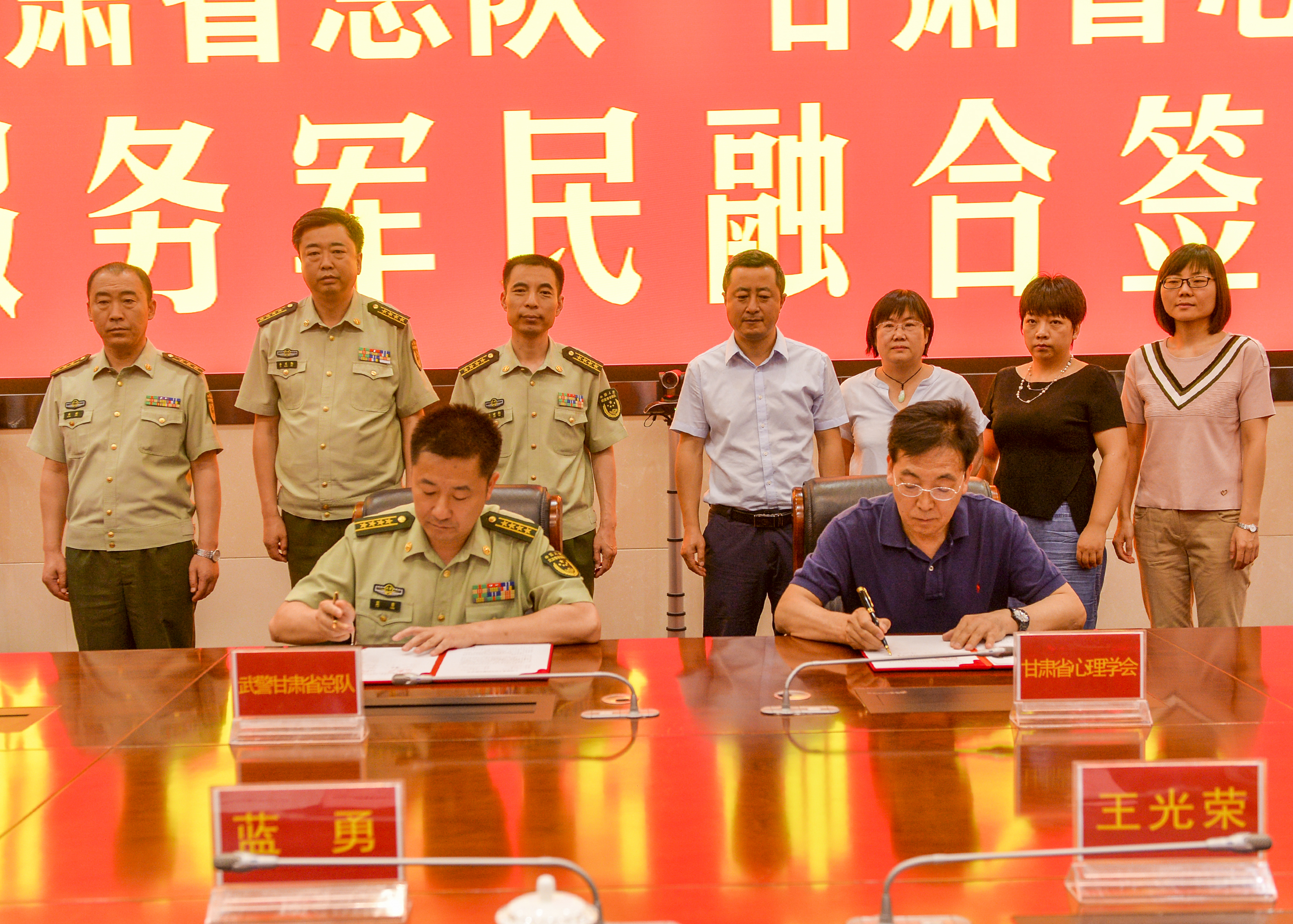 为践行心理学专业服务社会的使命,有力推进心理服务军民融合工作,6月24日上午,武警甘肃省总队与甘肃省心理学会和350vip浦京集团官网在总队机关举行心理服务军民融合签约仪式。仪式由总队政治工作部王建勋主任主持,总队蓝勇副政委和省心理学会王光荣秘书长,分别代表总队和省心理学会致辞并签署协议。350vip浦京集团官网丁小斌副院长、姜艳斐、朱雅雯老师、省心理学会常务理事王立冬和总队心理工作领导小组成员参加签约仪式。