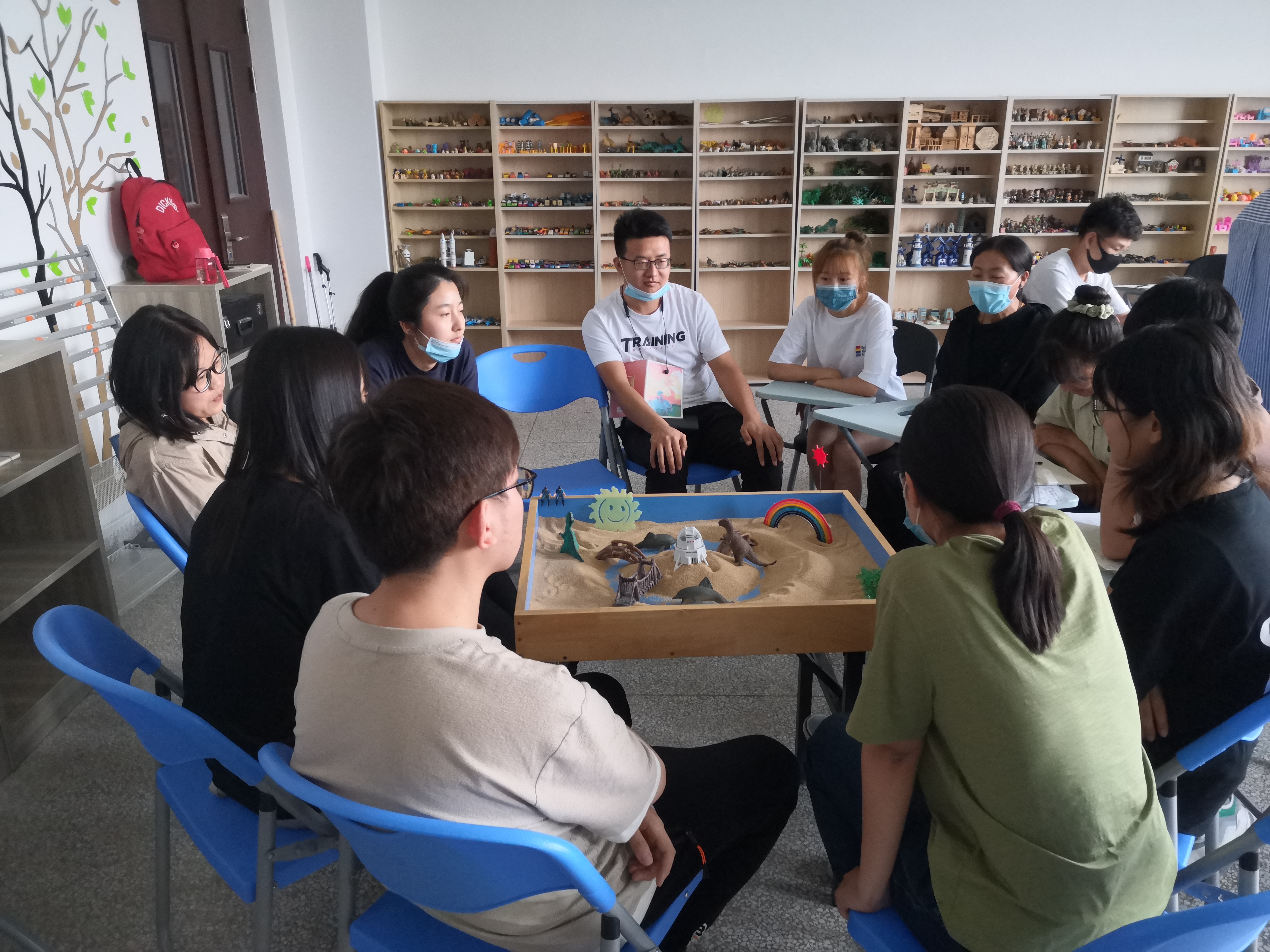 为了更好得服务全校同学,中心通过多种途径不断提升学生的专业实践能力。学生安全返校后中心教师立即组织学生开始专业学习和实践。每周六上午8:00-9:30在中心实习咨询师(研究生)的轮流带领下,14位见习咨询师针(本科生、研究生)对具体咨询技术进行模拟练习,探讨实践中遇到的问题。部分实习咨询师(研究生)还承担本科生《变态心理学》、《心理咨询的技术与方法》课程的助教工作。每周六上午9:45-11:45姜艳斐和朱雅雯老师针对实习咨询师(研究生)在咨询过程遇到的问题进行专业督导,中心全体同学进行观摩学习。