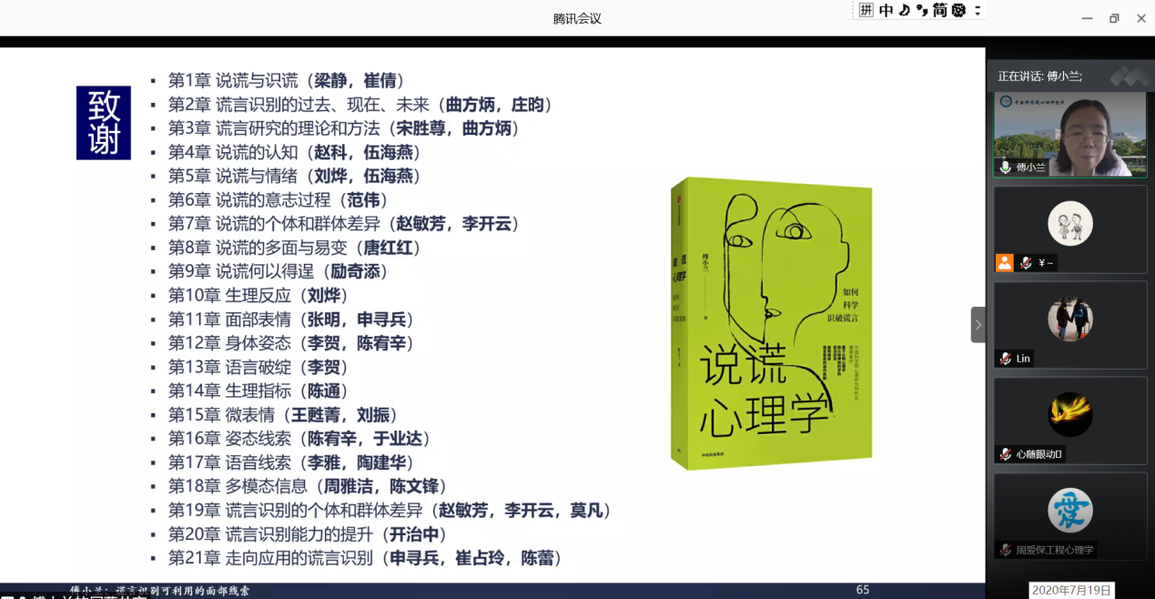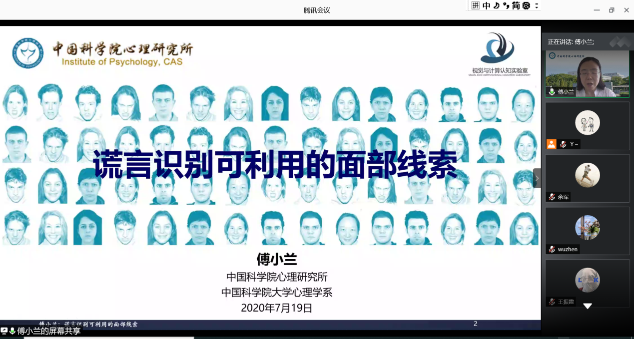2020年7月19日,应350vip浦京集团官网邀请,中国科学院心理研究所傅小兰研究员在线为浦京师生作题为《谎言识别可利用的面部线索》的学术报告。报告由350vip浦京集团官网院长赵鑫教授主持,200余名师生在线收听了报告。