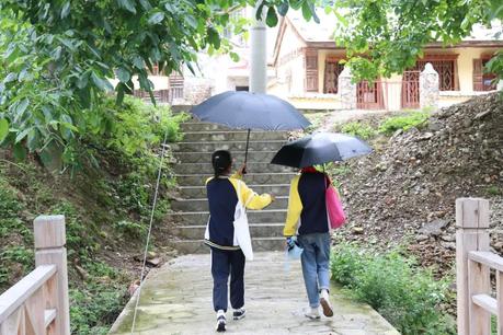 鹅嫚浸在山雨的潮湿中,放晴的天空让远处的山峦披上彩色的霞衣,清脆的鸟鸣声显得校园格外安静。实践队员也在忙碌的工作中,期待着明日校园的欢声笑语……