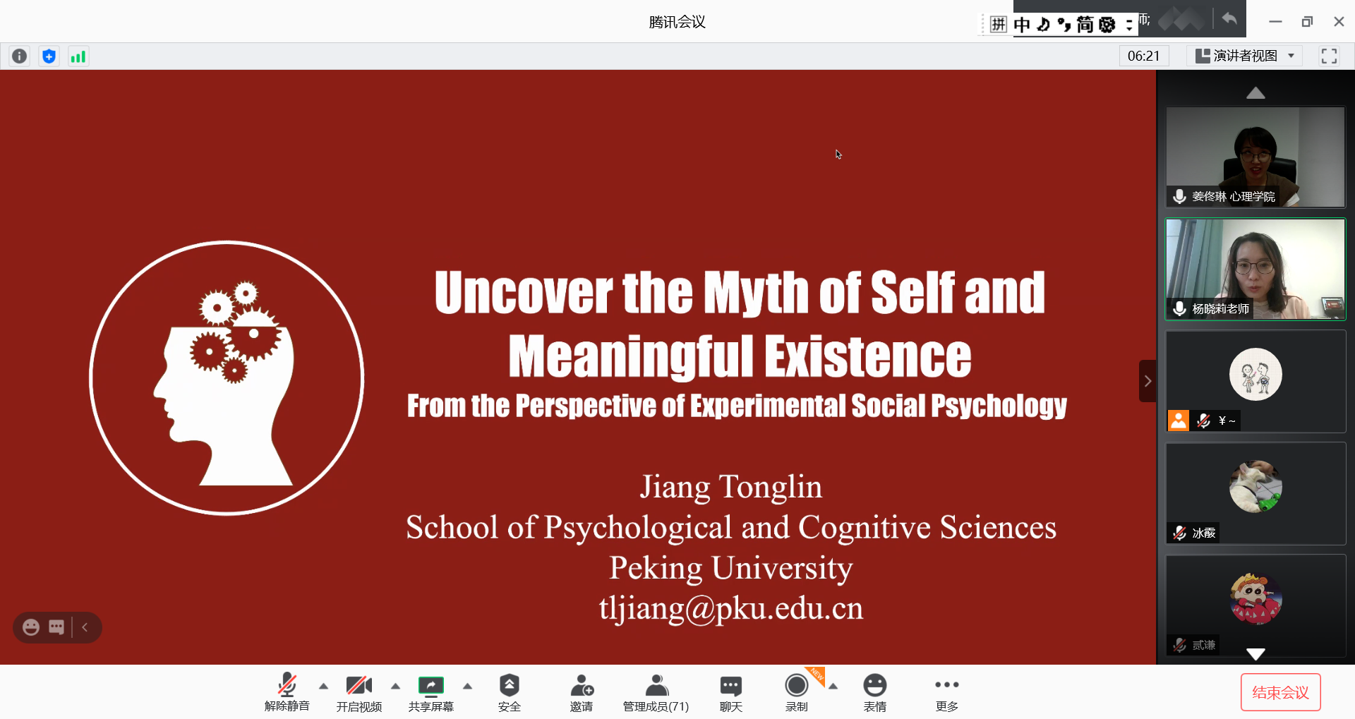 2020年9月17日,应350vip浦京集团官网邀请,北京大学研究员,博士生导师姜佟琳在线为浦京师生作题为《Uncover the Myth of Self and Meaningful Existence》的学术报告。报告由350vip浦京集团官网杨晓莉教授主持,140余名师生在线收听了报告。