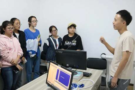 全体新生分为4支分队进行参观,在实验室里,通过师哥师姐们的讲解与演示,同学们对实验室注意事项、操作技巧、仪器的功能都有了初步的了解,不少同学还亲自体验,感受到了实验的乐趣。