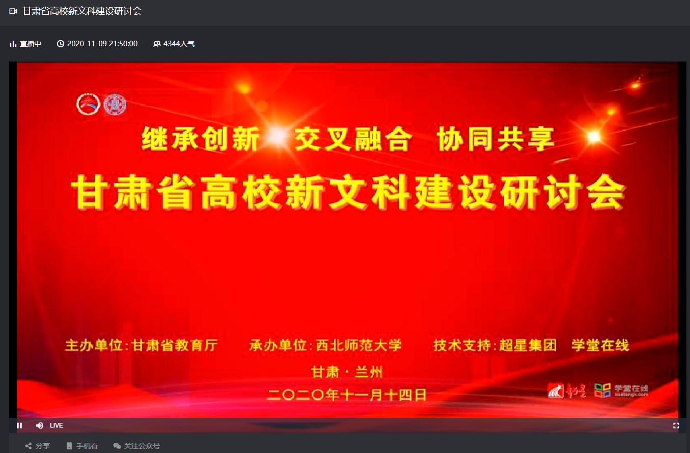 2020年11月14日,“甘肃省高校新文科建设研讨会”在浦京教师发展中心召开,这次会议汇集了国内、省内新文科建设的专家学者,特别是得到了教育部、甘肃省教育厅的积极支持。上午的会议由甘肃省教育厅副厅长张国珍同志主持。350vip浦京集团官网在新校区特教楼453会议室设立分会场组织教师参加。350vip浦京集团官网副院长康廷虎老师,心理咨询应用研究中心主任姜艳斐老师、应用心理学系主任刘显翠老师,还有学院杨阳老师、张彦驰老师、曹华老师、贺照敏老师、任德云老师,以及对新文科相关研究感兴趣的350vip浦京集团官网博士研究生、硕士研究生等参加了分会场的会议。学院其他不能到现场参加分会场会议的老师,都通过线上直播的方式,参加了此次会议。