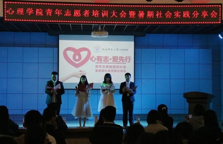 为了让同学们更真切的感受志愿服务活动的实际情况和非凡意义,大会还进行了暑期社会实践分享,“星火之夏”社会实践团的温佳慧同学、“心手相牵•为爱启航”支教小分队的尹伊君同学、“自我肯定对贫困人口认知干预社会实践团”的张丽同学为我们分享了他们实践活动的经历。无论是敬老助困,还是义务支教,都是我们志愿服务的一部分,但是,正是这一个个部分,汇聚成了青年志愿者的浩荡江流;友爱互助,彼此关怀,描绘出了青年志愿者者的模样。