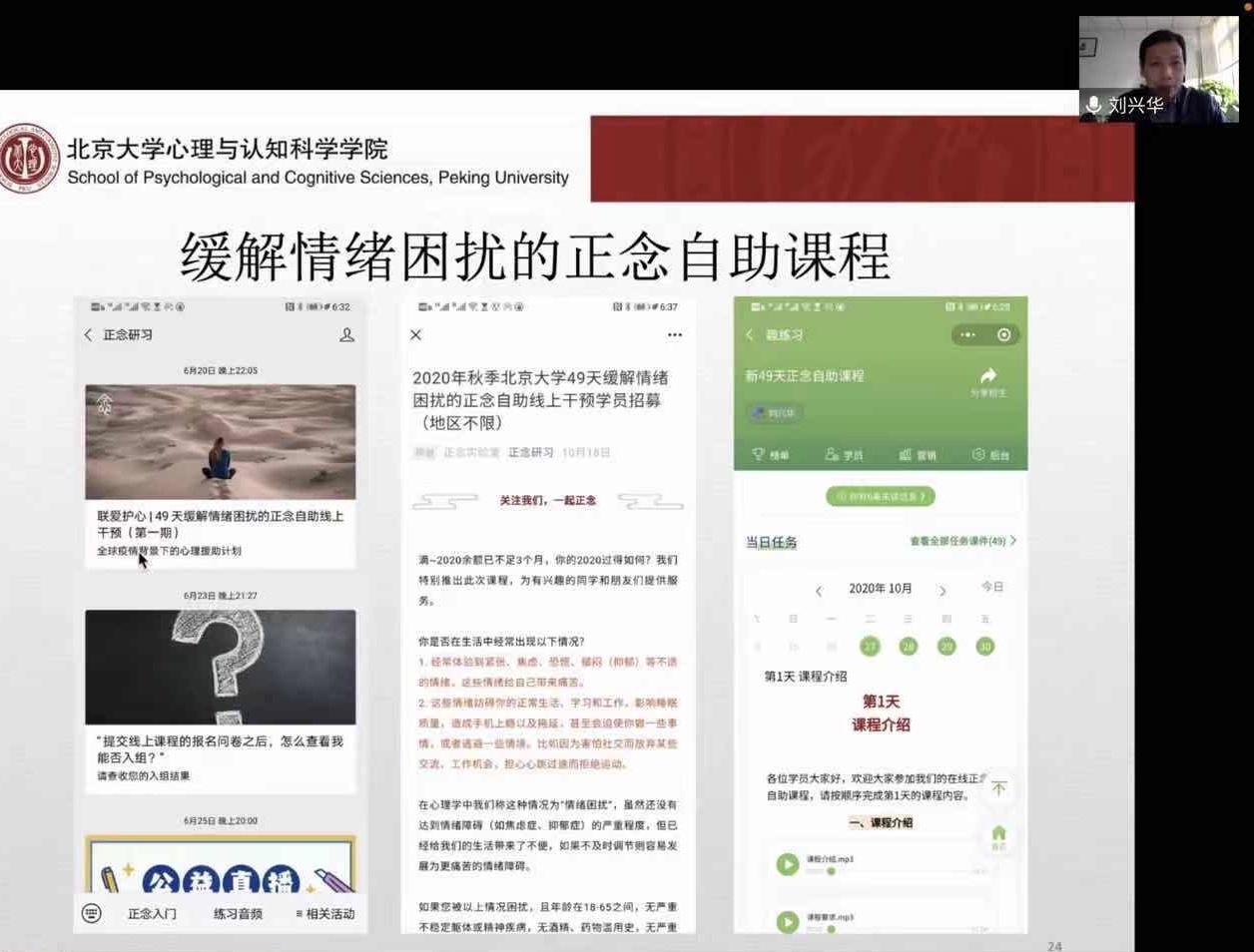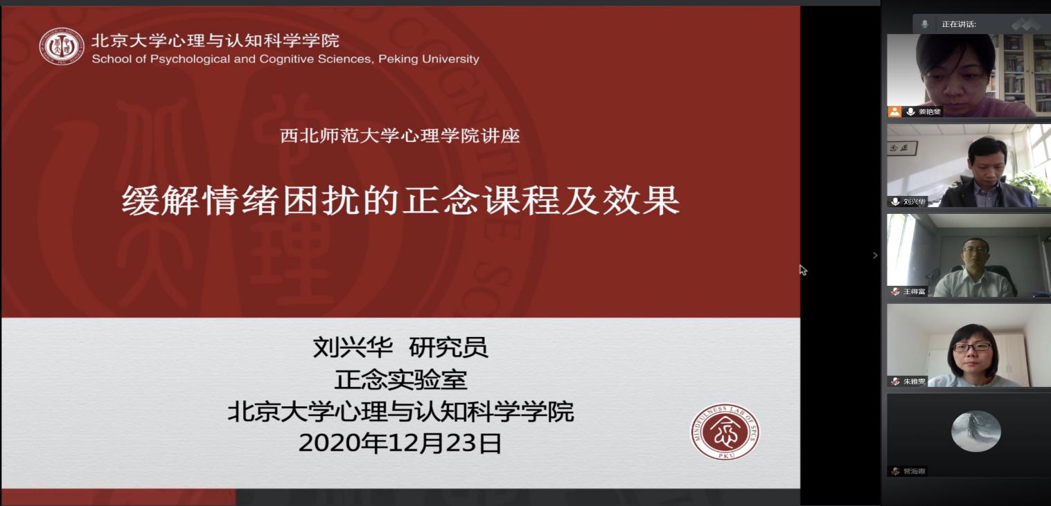 2020年12月23日,应350vip浦京集团官网邀请,北京大学心理与认知科学学院副院长,临床与健康心理学系主任,博士生导师刘兴华教授在线为浦京师生作题为《缓解情绪困扰的正念课程和效果》的学术报告。报告由350vip浦京集团官网姜艳斐副教授主持,110余名师生在线收听了报告。