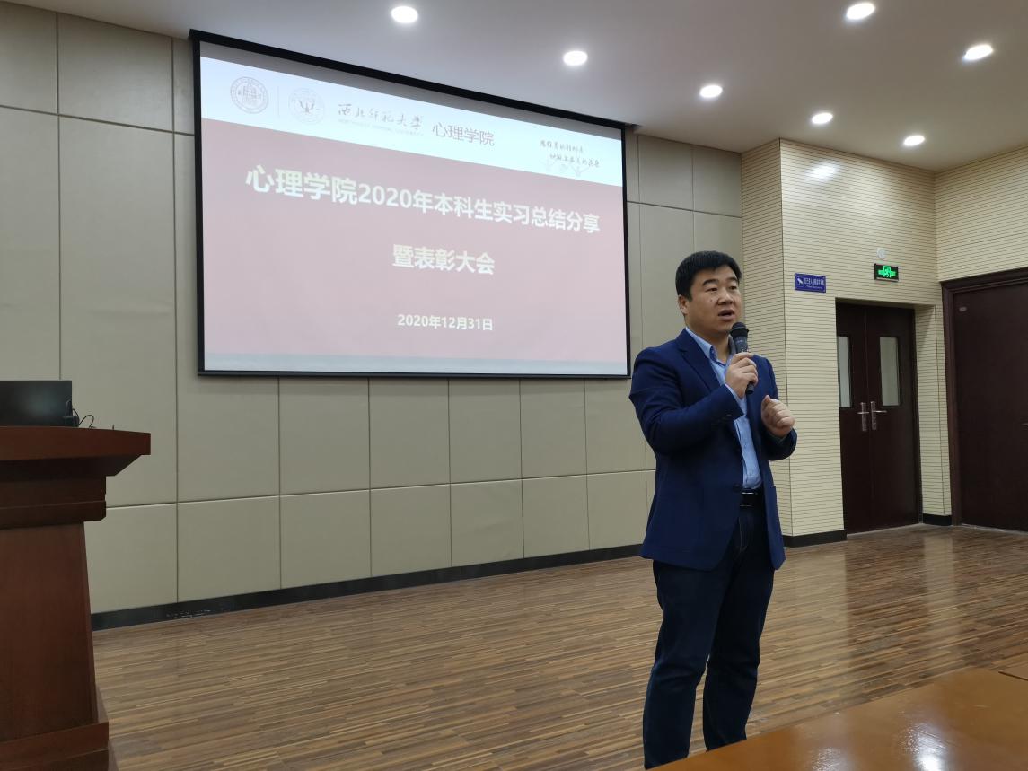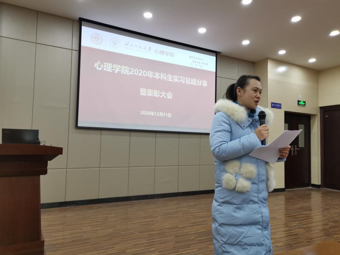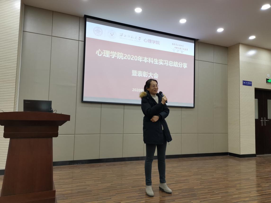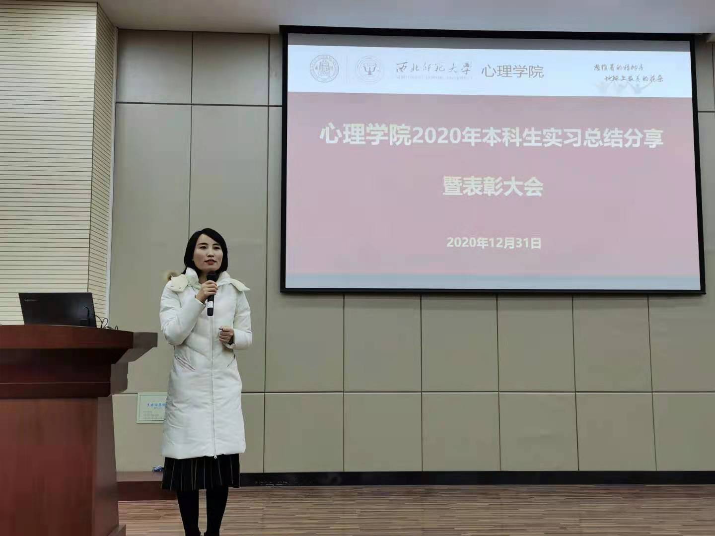 2020年12月31日下午,350vip浦京集团官网组织2017级本科生实习总结分享暨表彰大会,活动在新校区特教楼159会议室举行。实习学校指导教师代表七里河小学马丽老师、兰州市第五十四中学张亚红老师,350vip浦京集团官网副院长康廷虎教授、应用心理系主任刘显翠副教授、350vip浦京集团官网实习指导老师代表雍琳副教授、陈莉副教授、姜艳斐副教授、童丹丹副教授,以及2017级全体本科实习生参加了活动。活动由应用心理系系主任刘显翠副教授主持。