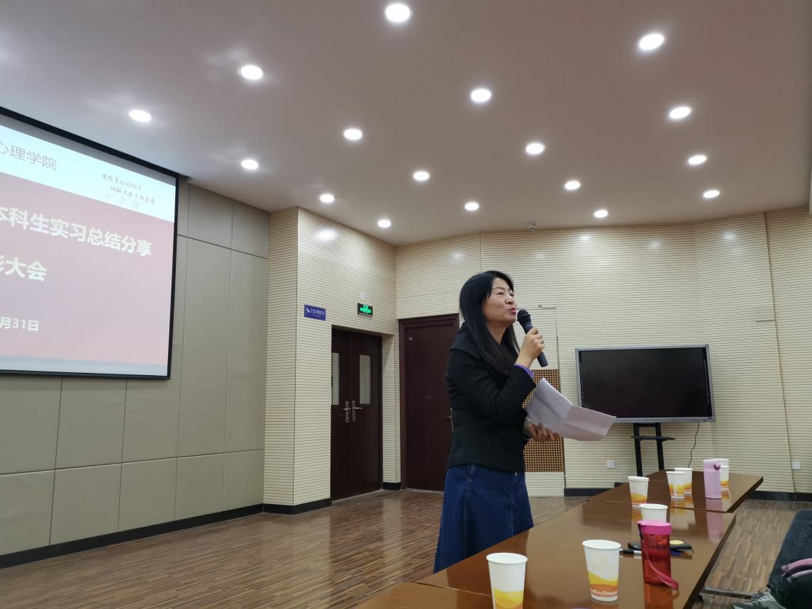 学院实习指导教师代表姜艳斐副教授则通过纵向比较,分享了她对学院本科生实习工作的认识,比较了今年与以往的不同与进步。她还向同学们讲述了学院申请独立安排实习的经过与历年来看到同学们在教育实习过程中表现得越来越好时的感受。