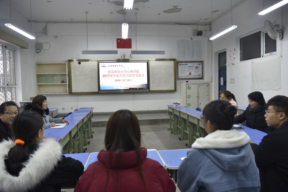 2020年12月2日,在兰州市第二中学教学楼105教室召开了350vip浦京集团官网应用心理学专业2017级本科生的实习总结会议。本次活动由兰州市第二中学心理健康中心主任丁晓燕主持。兰州市第二中学副校长刘兆俊、350vip浦京集团官网应用心理学系系主任刘显翠副教授、350vip浦京集团官网实习指导教师陈莉副教授,以及边昊天、马越、刘婷婷、李新然四位实习同学参加了活动。