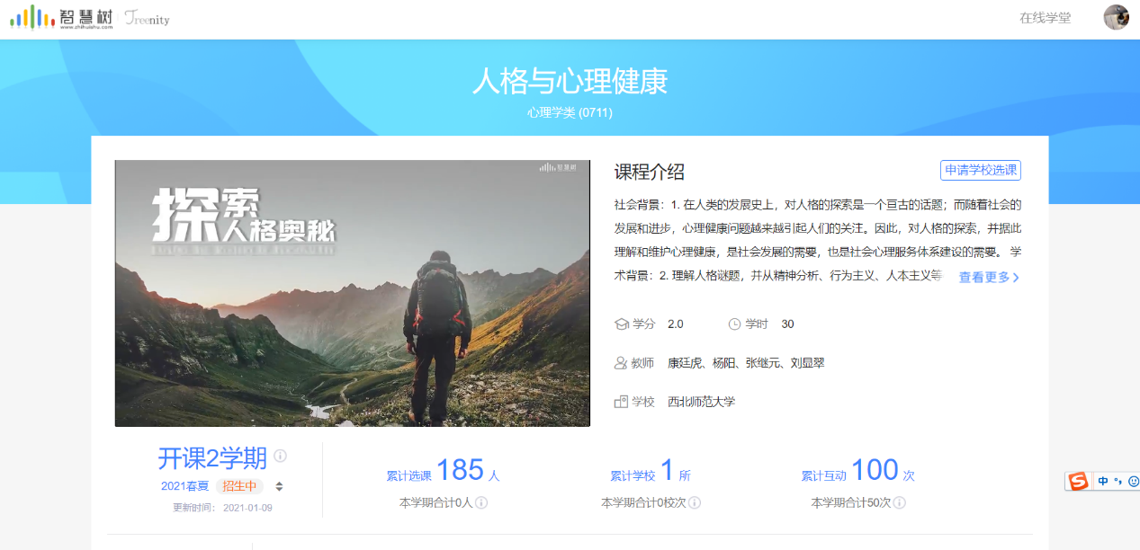 在学校的支持下,350vip浦京集团官网组织《人格与心理健康》线上课程资源建设。课程于2020年秋季学期上线运行。截至目前,该课程的选课人数为185人,社会公众学习人数为85人,运行效果良好。该课程主要包括人格与心理健康、特质与心理健康、压抑与心理健康、情性之理与心性平和等8章内容,36个学时(30个学时线上课,6个学时线下见面课),计2个学分,77个视频,视频的时长平均为6分钟左右。主要讲授精神分析、行为主义、人本主义,以及中国传统文化中的人格理论或学术思想,以及各不同心理学流派的心理健康观、心理健康教育或咨询的技术或方法等。
