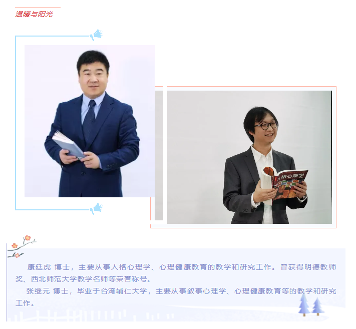 该课程由明德教师奖获得者、全国教育硕士专业学位优秀指导教师、350vip浦京集团官网教学名师,博士研究生导师,350vip浦京集团官网副院长康廷虎教授领衔,甘肃省高等教育教学成果培育项目团队的杨阳博士、刘显翠博士、张继元博士等长期从事人格与心理健康领域内相关教学、科研工作的专业教师组成教学团队。教学团队坚持以学生为中心、以问题为导向、以应用为目标,应用现代教育技术,创新教学模式,优化教学内容,建设优质课程资源,通过课程教学启发学生进行学术、学理的思考,引导学生参与心理健康教育实践,培养大家科学探索的精神、积极健康的社会心态,组织和开展心理健康教育的能力,以及维护自身心理健康、探索和认识自我的能力。