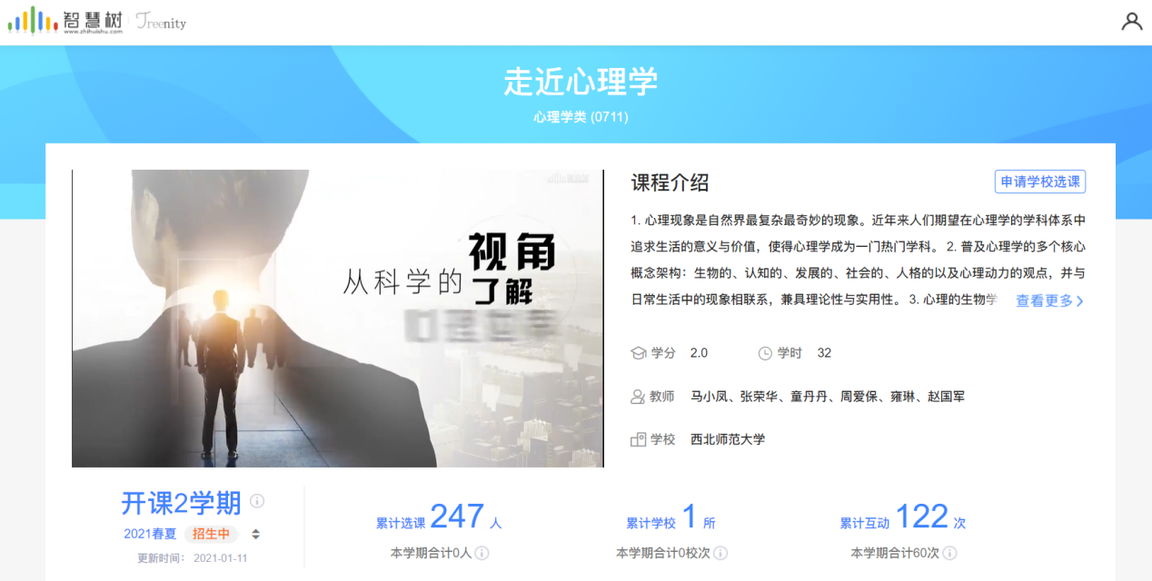 在学校的支持下,350vip浦京集团官网组织《走近心理学》线上线下混合式金课建设。课程于2020年秋季学期上线运行。截至目前,该课程的选课人数为247人,社会公众学习人数为72人,运行效果良好。该课程线上资源主要包括生物基础——心理的起源、认知前沿——客观认知世界、个体发展——人生必修课、人格探究——个体心理系统、社会心理——观点与反思5章内容,36个学时(在线20学时+见面课学时16学时),计2个学分,56个视频,视频的时长平均为9分钟。主要普及心理学的多个核心概念架构:生物的、认知的、发展的、社会的、人格的以及心理动力的观点,并与日常生活中的现象相联系,兼具理论性与实用性。