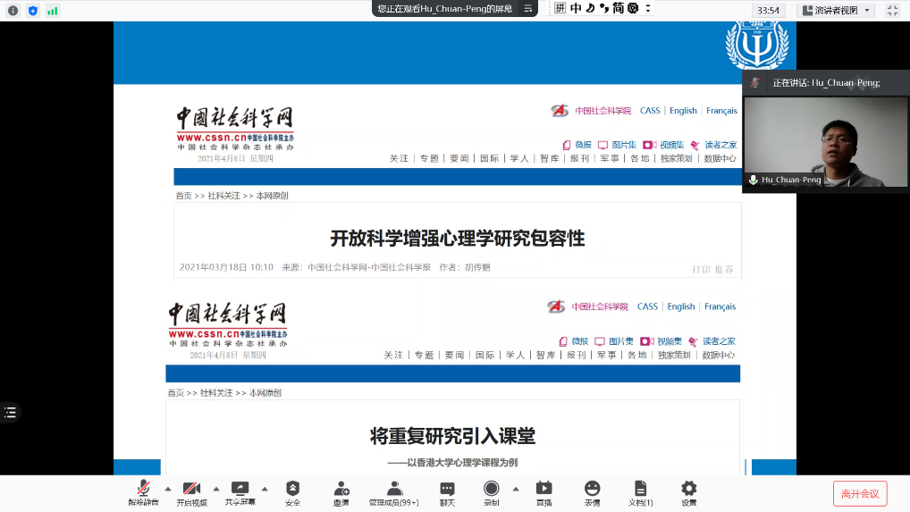 2021年4月8日,应350vip浦京集团官网邀请,南京师范大学胡传鹏博士在线为浦京师生作题为《心理学研究中可重复性危机的十年:回顾与展望》的学术报告。报告由350vip浦京集团官网赵鑫院长主持,130余名师生在线收听了报告。