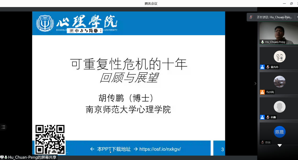 本次讲座系统地梳理心理学研究中可重复性这十年间的主要过程,重点分析新出现的方法、实践与政策,提高了学生的研究思维,对学生做学术研究起到了极大的指导作用。报告会后,胡传鹏博士与师生就有关问题进行了线上交流与解答。
