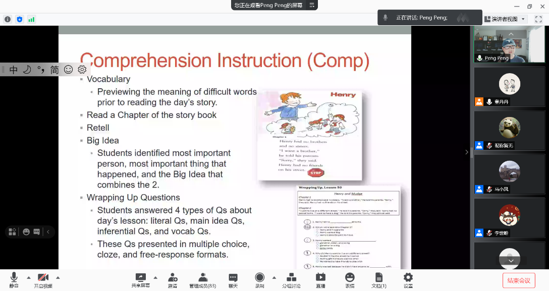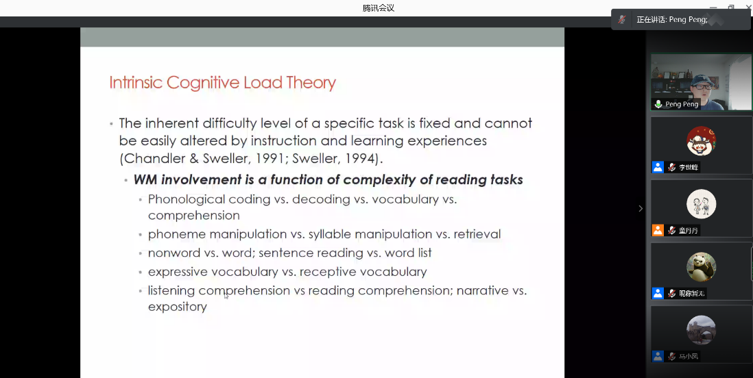 在报告中,彭老师首先结合“工作记忆领域一般性理论”、“认知负荷理论”以及“高级认知双加工过程理论”阐述了工作记忆和阅读的关系,揭示了工作记忆和阅读既具有领域一般性的关系也具有领域特异性的关系。此外,这一关系在不同的年级水平中表现出不同的特点,低年级儿童的阅读都需要使用工作记忆,而高年级儿童的基本阅读技能本身就更有效率较少依赖工作记忆。接下来,彭老师通过分享工作记忆训练促进低年级儿童阅读能力提升的系列研究,探讨了通过工作记忆训练和阅读技能训练能够锻炼儿童在阅读中有效加工和记忆信息的可行性,并且进一步讨论了工作记忆训练结合阅读技能训练是否能够产生“1+1>2”的效果这一问题。