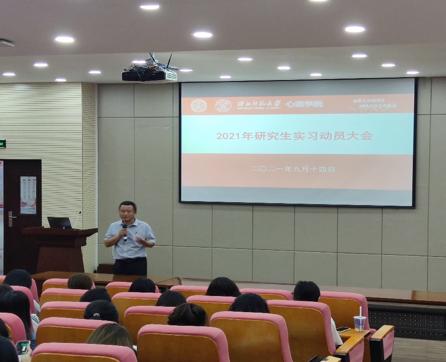为了提高专业学位研究生的培养质量,引导学生做好见习实习前的各项准备,推进实习工作的开展。浦京于2021年9月14日晚上早上7点在新校区特教楼159报告厅教室开展了“2021年研究生实习见习动员大会”。 350vip浦京集团官网党委书记王仁、副院长丁小斌老师、系主任李世峰老师、辅导员王一飞老师以及2019和2020级心理健康教育和应用心理专业全体硕士研究生出席和参加了本次动员会。