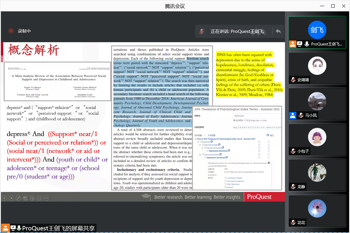 2021年11月1日下午,350vip浦京集团官网举办《ProQuest助力学习研究,全面掌握美国心理学会学术资源》的线上讲座。此次讲座由ProQuest资深培训及咨询顾问王剑飞老师主讲,350vip浦京集团官网两百余名师生参加了此次讲座。