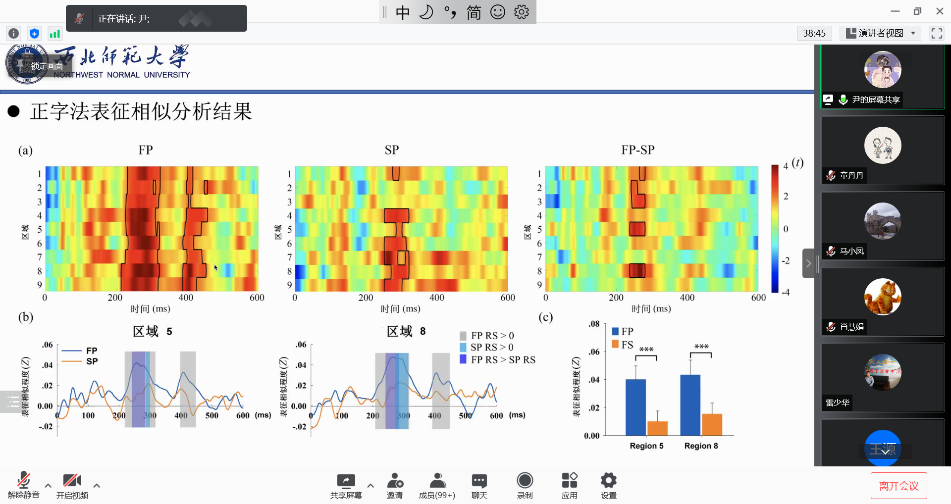 尹老师首先从字形识别过程的视觉分析解码系统、书写运动影响阅读字形识别过程、书写影响阅读字形识别过程的其他因素三个方面对书写运动参与阅读字形识别过程的研究现状进行了综述。而后,尹老师分别对书写运动能否影响熟练阅读者阅读时的深度正字法加工阶段、书写运动影响阅读字形识别过程的机制这两项研究进行系统的介绍,并在报告中着重分享了实验范式和研究方法,让同学们对该领域的研究进展和实验方法有了较为充分的了解。