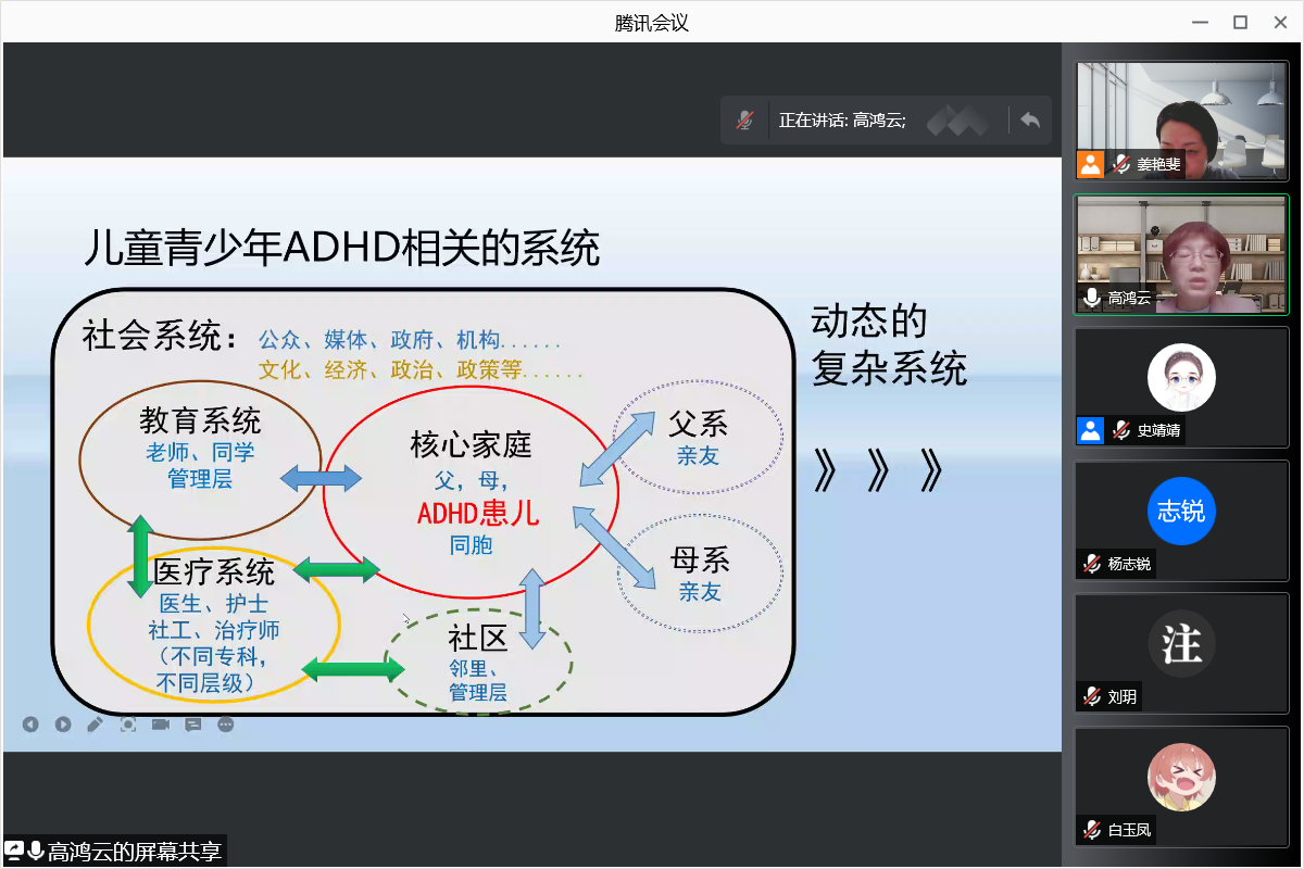 首先,高鸿云博士从“小男的故事”引出注意缺陷多种障碍的概念,而后介绍了中国儿童青少年ADHD的患病率和历史演变,进一步引出今天报告的主题——从系统视角谈谈儿童ADHD的困境及解决之道。接下来,高老师分别从“如何理解儿童青少年的ADHD?”、“儿童青少年ADHD相关的系统”、“儿童ADHD的常规诊断方法”、“ADHD诊疗困境”及“儿童青少年ADHD的系统干预”等方面对儿童ADHD的困境及解决之道进行了详细讲授,引发同学们对该研究领域的关注和了解。