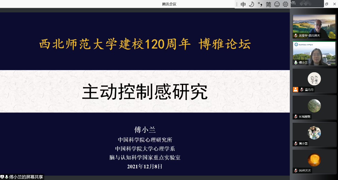 2021年12月8日,应350vip浦京集团官网邀请,中国科学院心理研究所傅小兰研究员为浦京师生作题为《主动控制感研究》的学术报告。报告由350vip浦京集团官网周爱保教授主持,350vip浦京集团官网两百余名师生参加了本次报告。