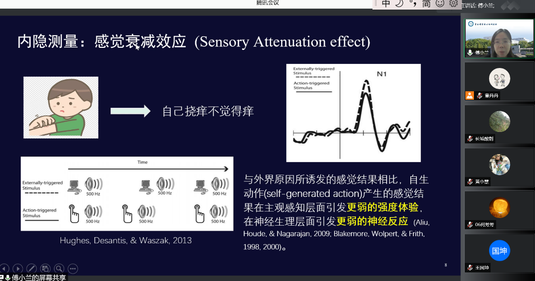首先,傅老师基于主动控制感和已有经典测量范式两个方面介绍了研究背景和基础知识。而后,傅老师从主动控制感与主观意识、主动控制感与触觉反馈、主动控制感与情绪效价、主动控制感的脑机制、社会交互中的主动控制感、行为中的主动控制感与责任归属等方面的已有研究对主动控制感研究的行为学和神经科学结果进行了详细讲授,引发同学们对该研究领域的兴趣和了解。