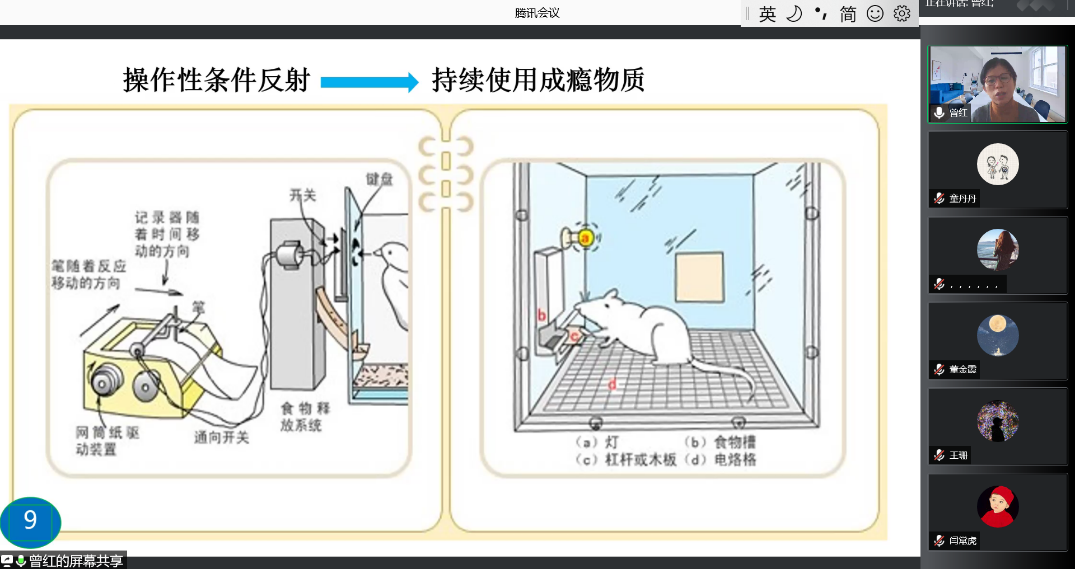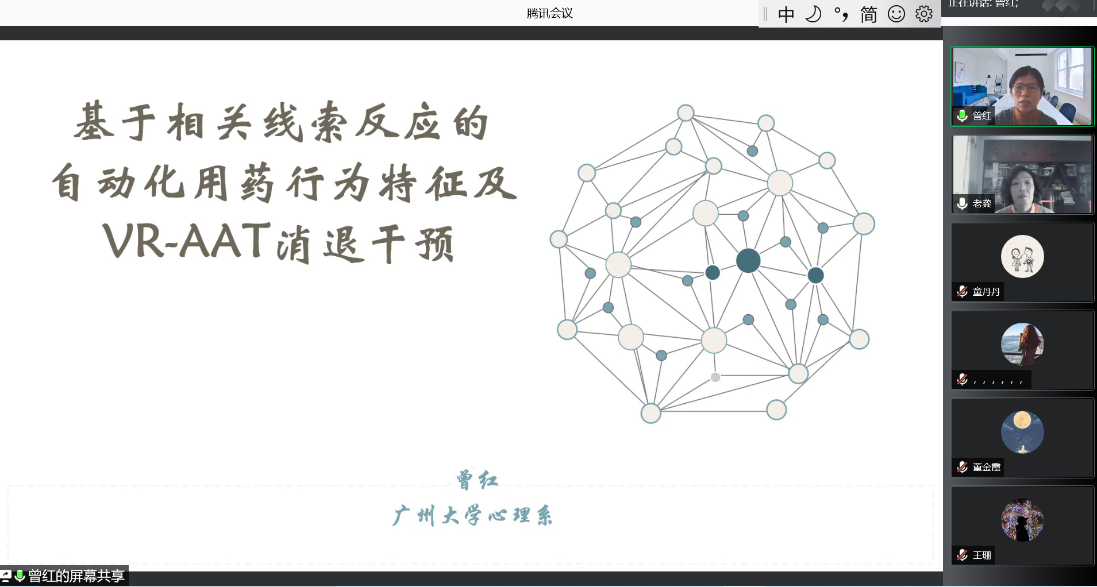 首先,曾红教授通过对药物成瘾的临床特征、奖赏效应、成瘾机制、习惯性使用与动作记忆等内容的讲解梳理了药物成瘾的研究背景,并进一步引出报告主题。而后,曾红教授分别从相关线索下习惯性用药行为的性质及神经机制研究、基于相关线索-习惯性用药行为联结的VR提取用药动作记忆AAT消退训练研究、药物成瘾者危机干预案例分析三个方面对基于相关线索反应的自动化用药行为特征及VR-AAT消退干预进行了详细的阐述,引发同学们对该研究领域的进一步了解和关注。