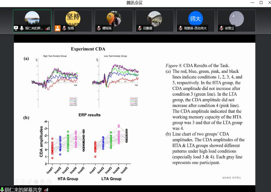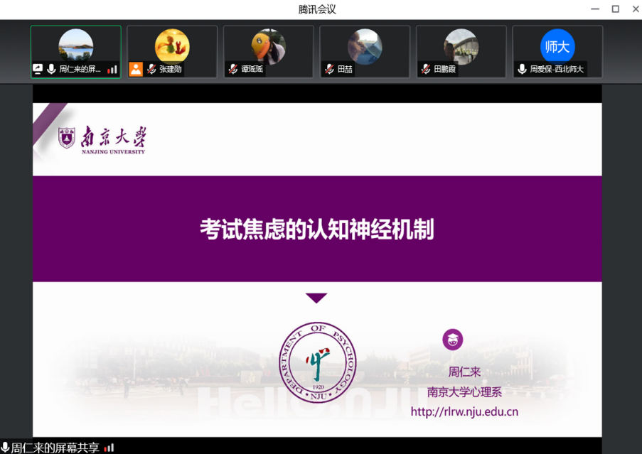 周仁来教授首先向大家介绍了考试焦虑的概念、诊断标准、症状、理论解释等相关知识。接着,周仁来教授分别从特征、机制、干预三个方面跟大家分享了其研究团队有关考虑焦虑的系列研究工作。周仁来教授耐心细致的讲解使同学们对考试焦虑问题有了更深层次的认识。