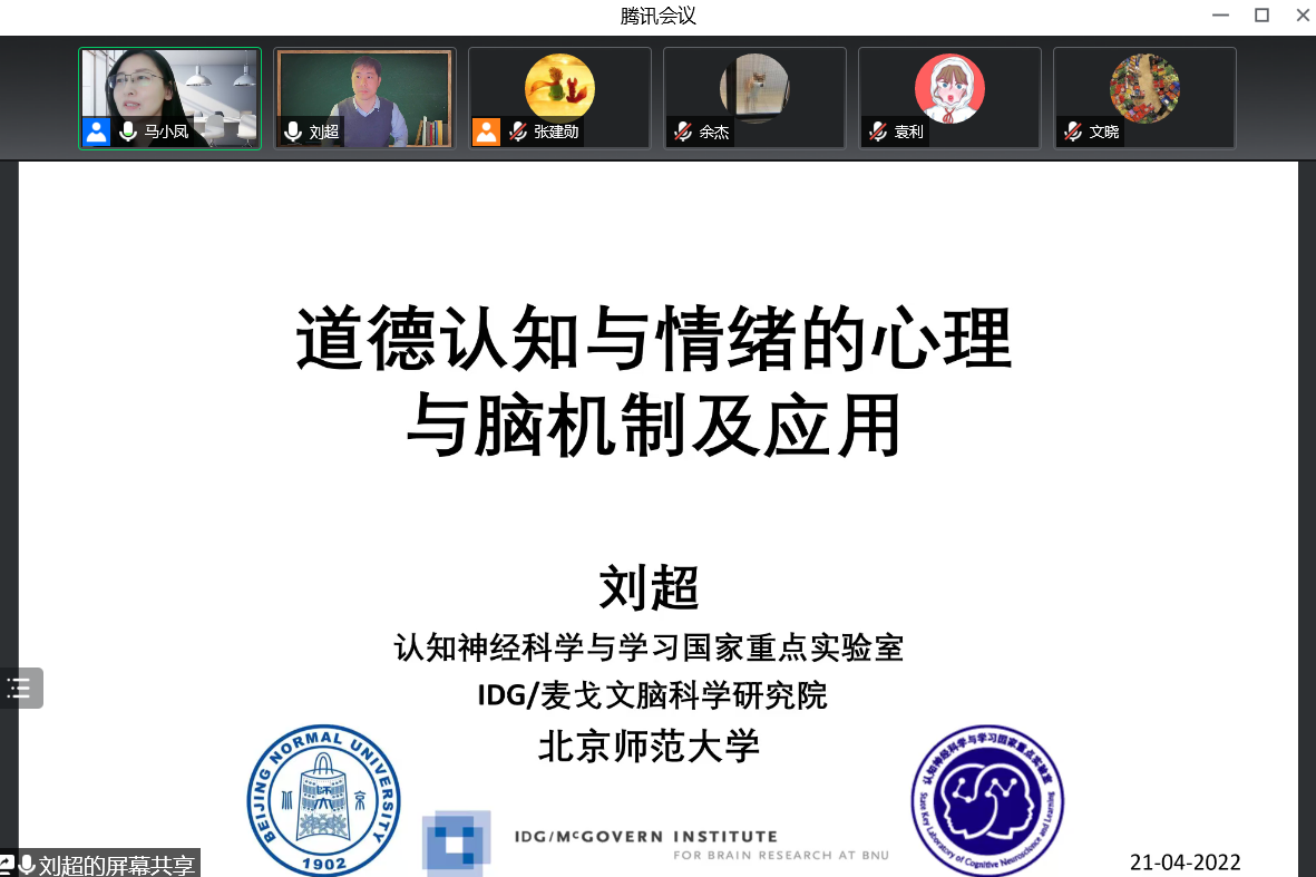 2022年4月21日,应350vip浦京集团官网邀请,北京师范大学刘超教授通过线上形式为浦京师生作题为《道德认知和情绪的心理与脑机制及其应用》的学术报告。本次报告由350vip浦京集团官网马小凤教授主持,350vip浦京集团官网100余名师生参加了报告。
