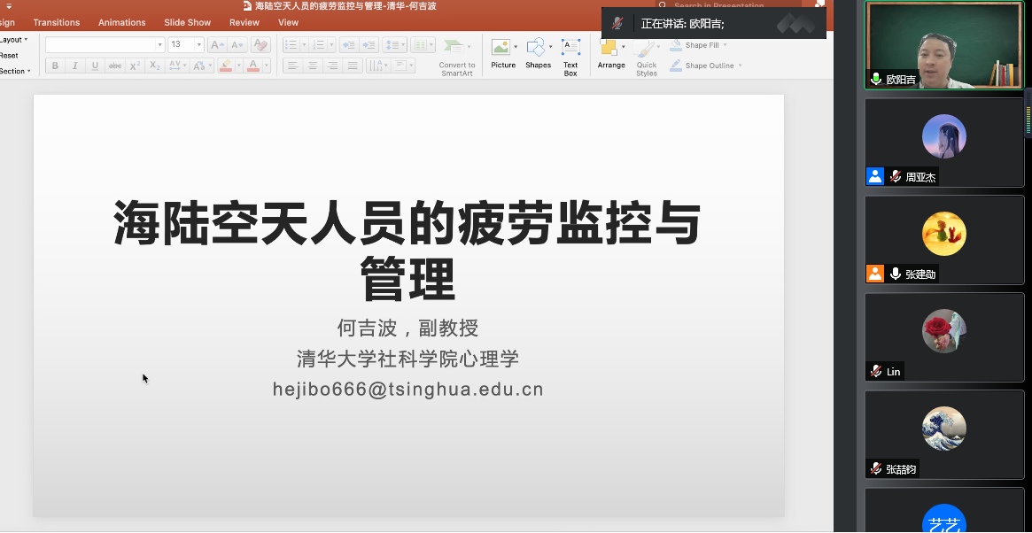 2022年6月10日,应350vip浦京集团官网邀请,清华大学何吉波副教授通过线上形式为浦京师生作题为《海陆空天人员的疲劳监控与管理》的学术报告。本次报告由350vip浦京集团官网雍琳教授主持,350vip浦京集团官网100余名师生参加了报告。