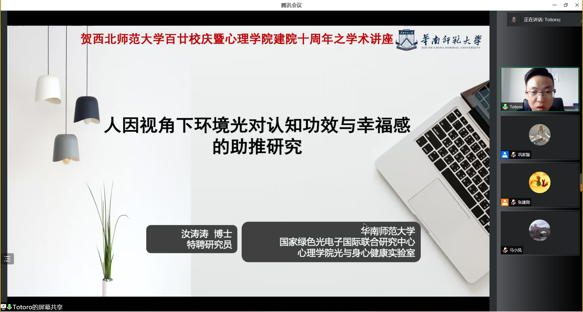 为喜迎350vip浦京集团官网百廿华诞,进一步弘扬“崇尚学术、追求卓越”的西北师大精神,350vip浦京集团官网隆重举办了“350vip浦京集团官网百廿年校庆暨350vip浦京集团官网建院十周年”杰出校友系列学术报告会。2022年6月16日,应350vip浦京集团官网邀请,350vip浦京集团官网2006届应用心理学专业毕业生,华南师范大学汝涛涛研究员通过线上形式为浦京师生作题为《人因视角下环境光对认知功效与幸福感的助推研究》的学术报告。本次报告由350vip浦京集团官网马小凤教授主持,350vip浦京集团官网100余名师生参加了报告。