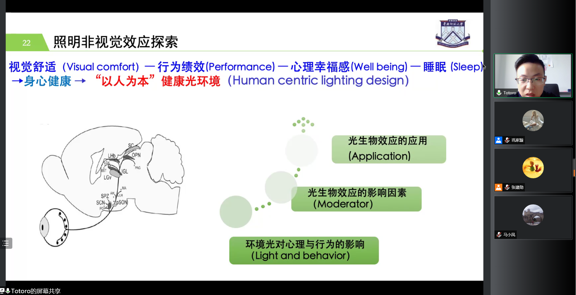 汝涛涛研究员首先介绍了光对健康的影响、健康人因光环境研究的重要性、光与身心功能的关系,并进一步阐述了目前人因照明的应用场所、国内外人因照明研究现状。其次,汝涛涛研究员讲解了环境光影响心理功能的生理机制。此外,汝涛涛研究员分享了其研究团队围绕该主题开展的系列研究。这些研究主要考察了照明的非视觉效应。最后,汝涛涛研究员基于动态照明理念提出并验证了新型健康光环境构建路径,并对未来建立“以人为本”的人因光环境进行了展望。汝涛涛研究员的精彩讲解引发了同学们对人因光环境相关问题的思考。