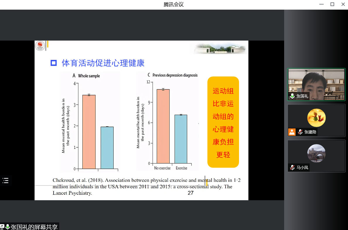 在本次讲座中张国礼副教授围绕心理健康、认知发展、心理社会性发展等方面向大家详细介绍了体育活动的心理效益。张国礼副教授也跟大家分享了其课题组有关体育活动对内隐问题行为的改善作用及其作用机制、体育活动增加人际交往能力的作用机制、体育活动促进青少年社会适应的作用机制等方面的研究及其主要发现。最后,张国礼副教授强调在看待体育活动对认知发展的促进作用时不能忽视学习、青少年自身认知发展等问题。张国礼副教授两个小时的精彩讲解引发了同学们的浓厚兴趣。