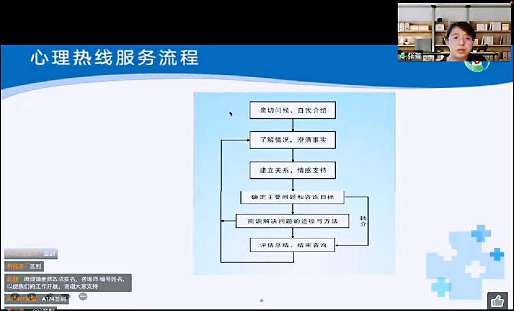 第一部分由西安市精神卫生中心中级心理治疗师、中国心理学会临床与咨询心理学专业注册系统注册心理师、国家二级心理咨询师张蕾老师为我们介绍了心理热线的接线流程。首先张老师介绍了心理热线面向的群体以及主要工作内容。其次,张老师详细阐述了心理热线的服务流程,其中穿插了一些来话者和接线员的对话,让我们更加明白接线员的工作开展流程及注意事项。最后,张老师为我们讲述了特殊来电的处理流程。张老师的精彩讲解引发了同学们对心理服务热线工作的思考。