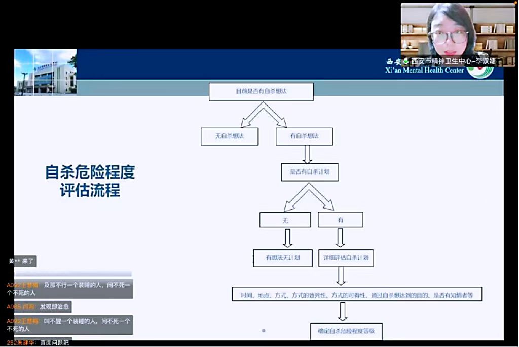 第二部分由心理治疗师、中国心理学会临床与咨询心理学专业注册系统注册心理师、国家二级心理咨询师李汉婕老师为我们介绍了有关自杀风险的接线流程。首先确定来话者对自杀的态度,评估自杀危险程度,而后收集到更多的信息,寻找来话者想改变的因素,从而对自杀进行干预,确保来话者的安全。