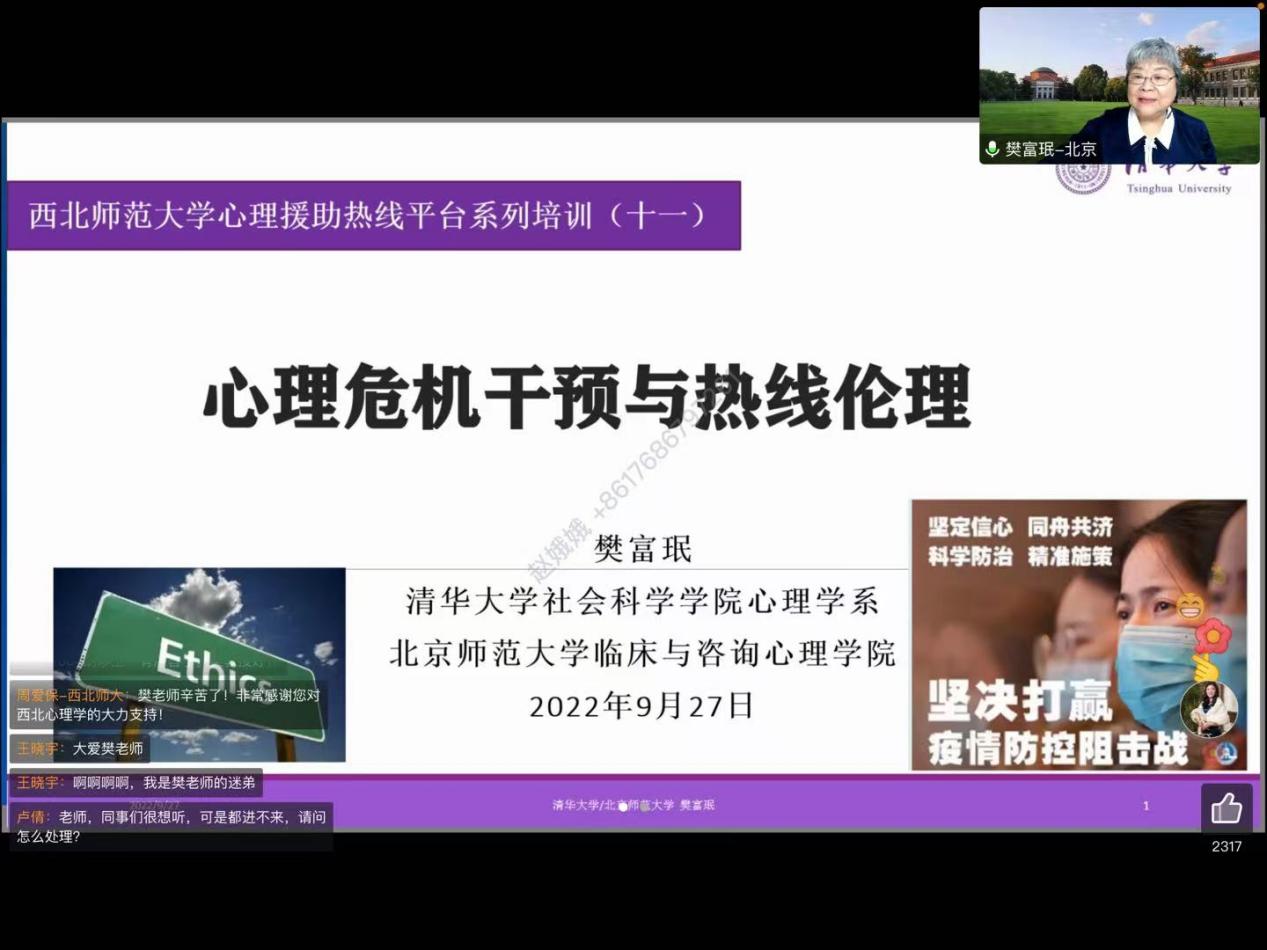 2022年9月27日,350vip浦京集团官网心理援助热线平台通过线上形式对本次热线服务的心理志愿者进行了第十一场心理援助热线培训。本次培训由本热线平台总协调,总督导吴博副教授主持,特别邀请了清华大学心理学教授、原清华大学心理学系副主任、北京师范大学心理学部临床与咨询350vip浦京集团官网院长、中国心理学会注册督导师樊富珉教授主讲,近500多名志愿者参加了此次培训。