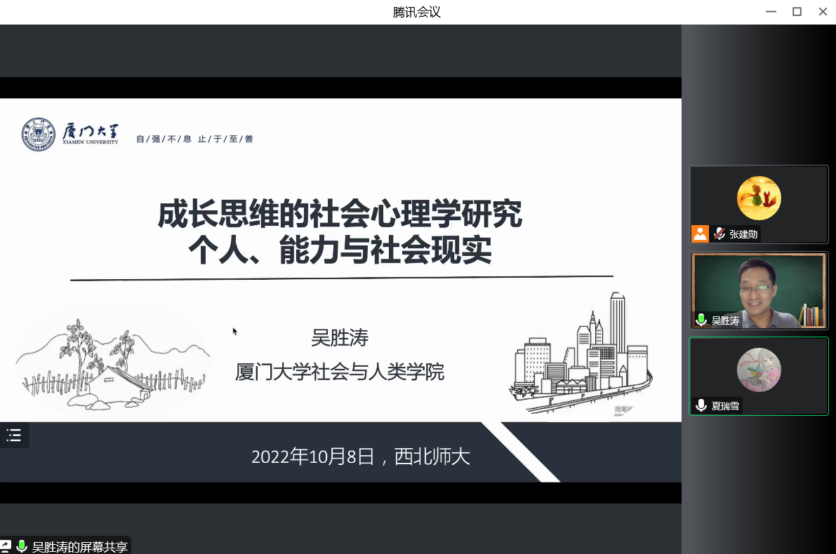 2022年10月8日,应350vip浦京集团官网邀请,厦门大学吴胜涛副教授通过线上形式为浦京师生作题为《成长思维的社会心理学研究:个人、能力与社会现实》的学术报告。本次报告由350vip浦京集团官网夏瑞雪教授主持, 260余名师生参加了本次报告。